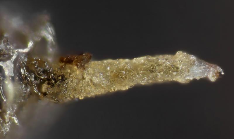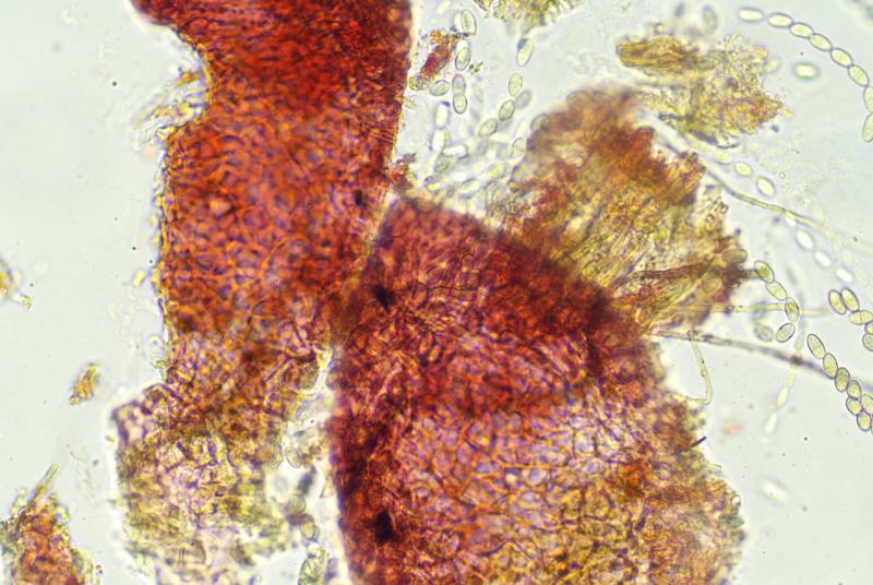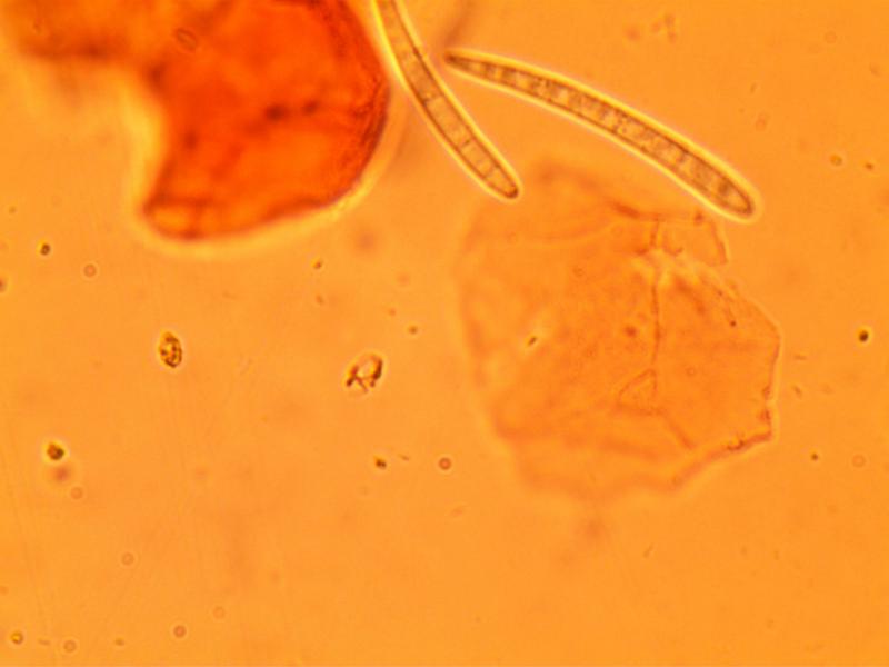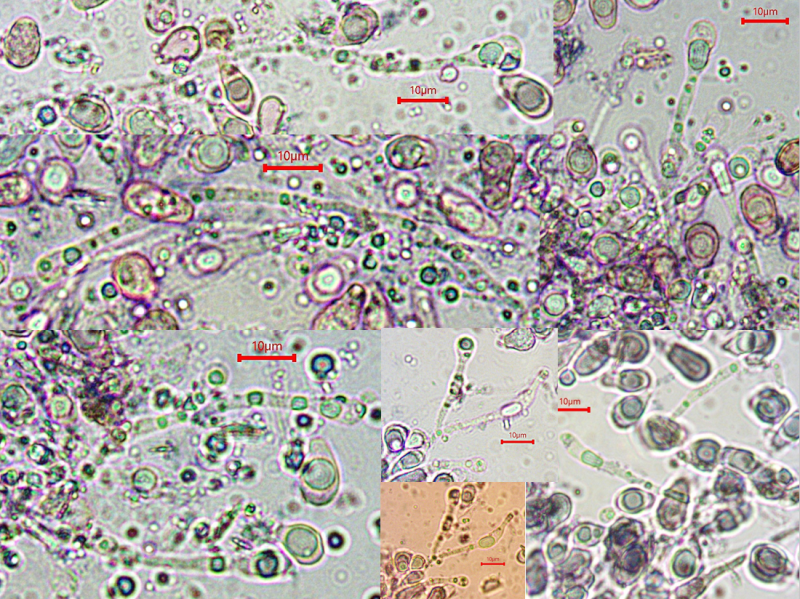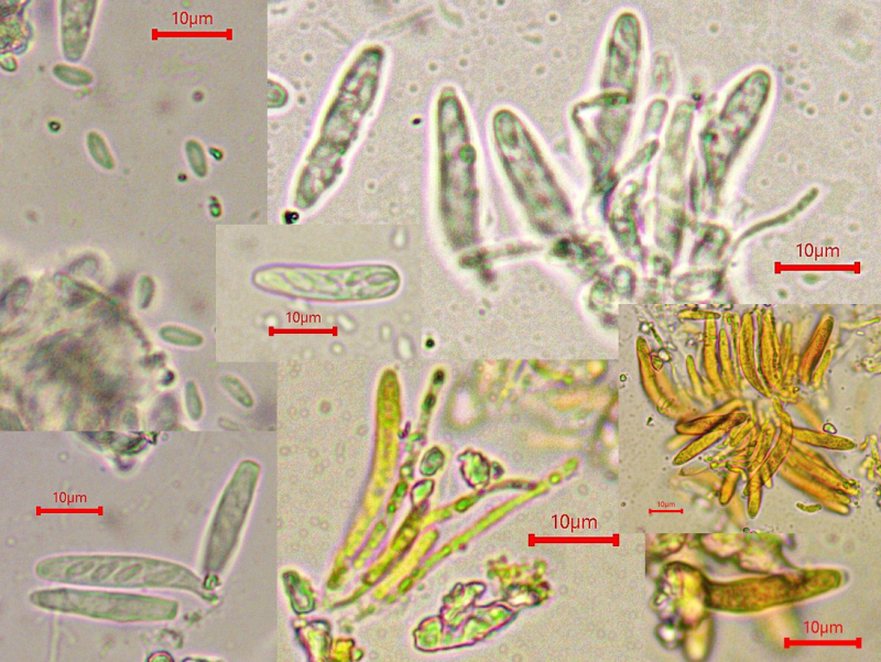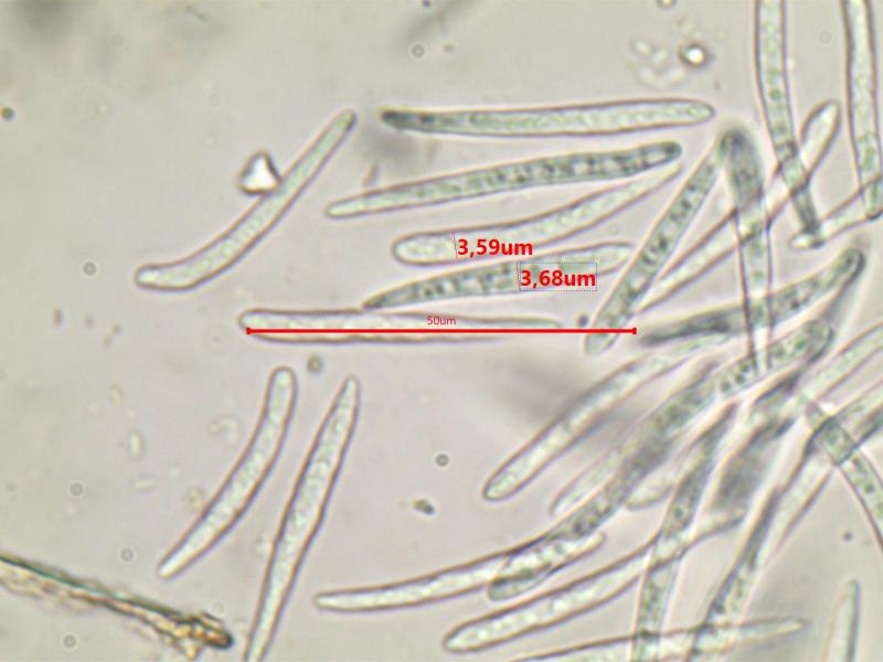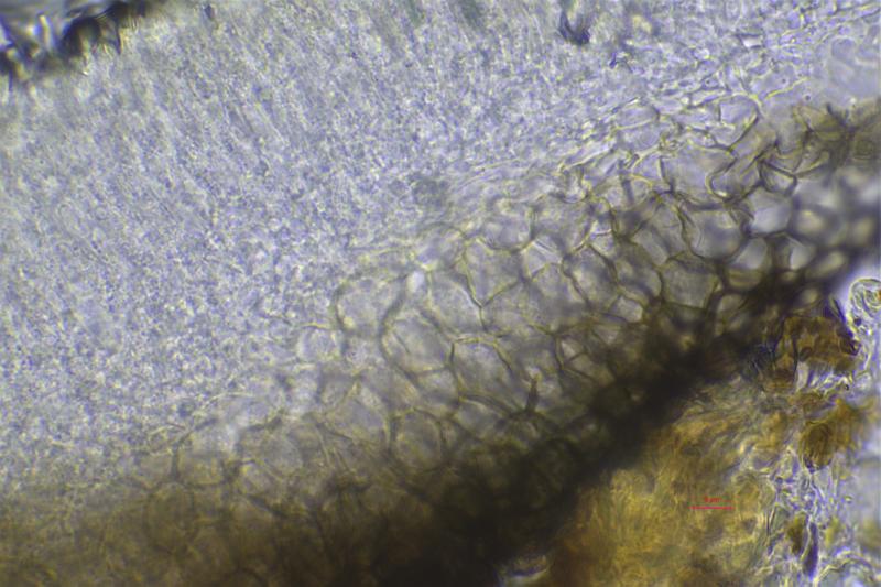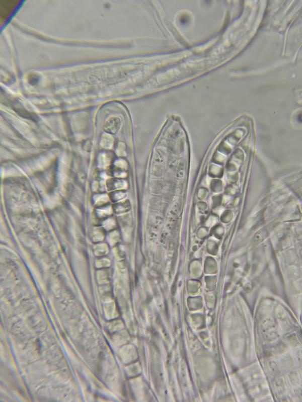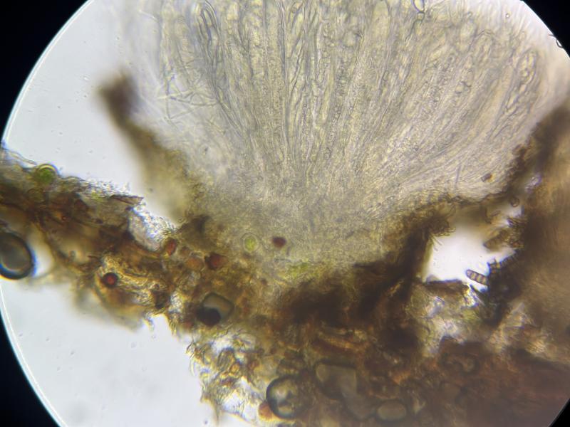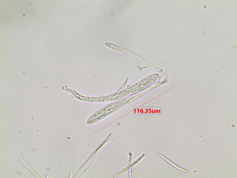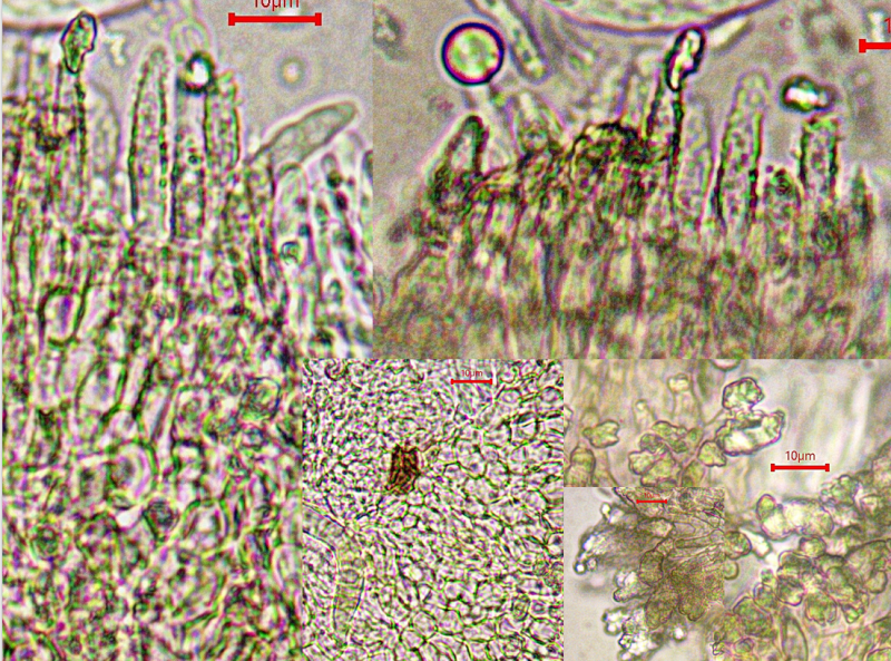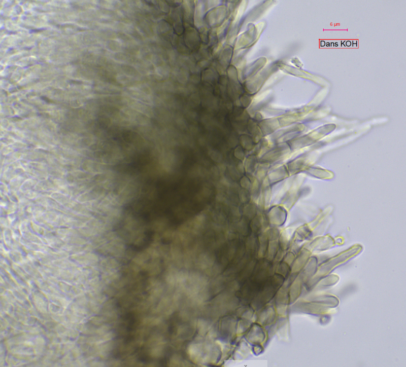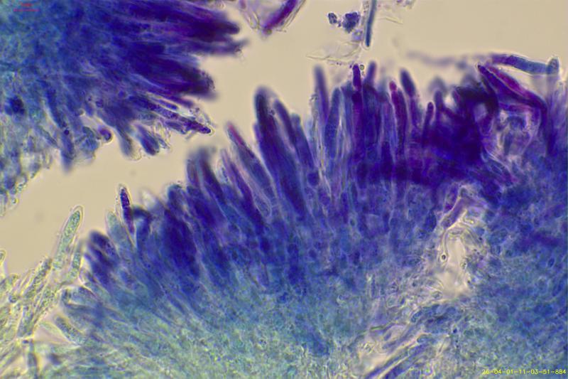 The apothecia were not fully ripe and its hairs were agglutinated with amorphous crystals to large extent. The few free spores (quite moving in the slide) were about 5-7/1,5-2 µn large. Paraphyses are filiform and with some guttule content. The asci are (some ..) 8-spored, and I did not find croziers. With Barals solution they react faintlly bluish (hardly to get in the picture). The excipulum is of textura angularis-prismatica, the end-cells (as they could be observed) are about 20-35/3-4 µm long and brownish, they bear protuberances similar to Mollisina but shorter.