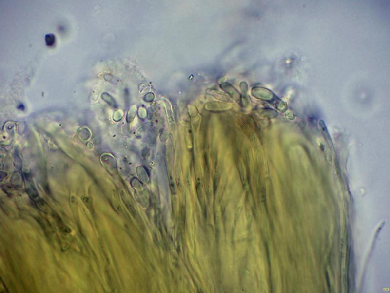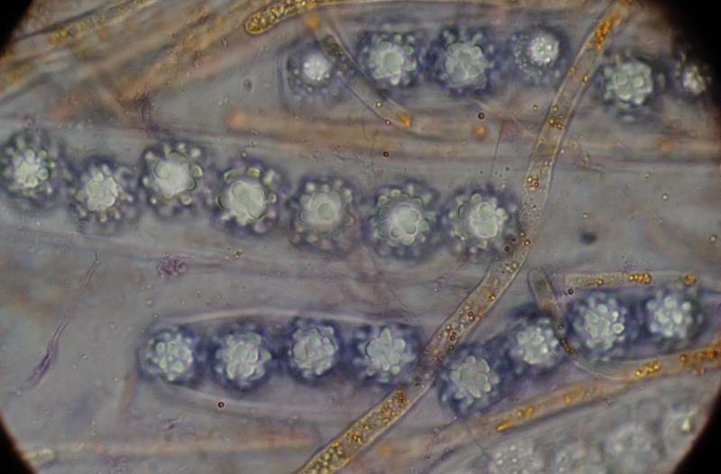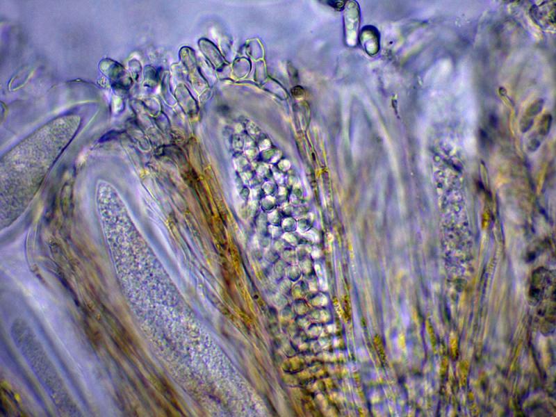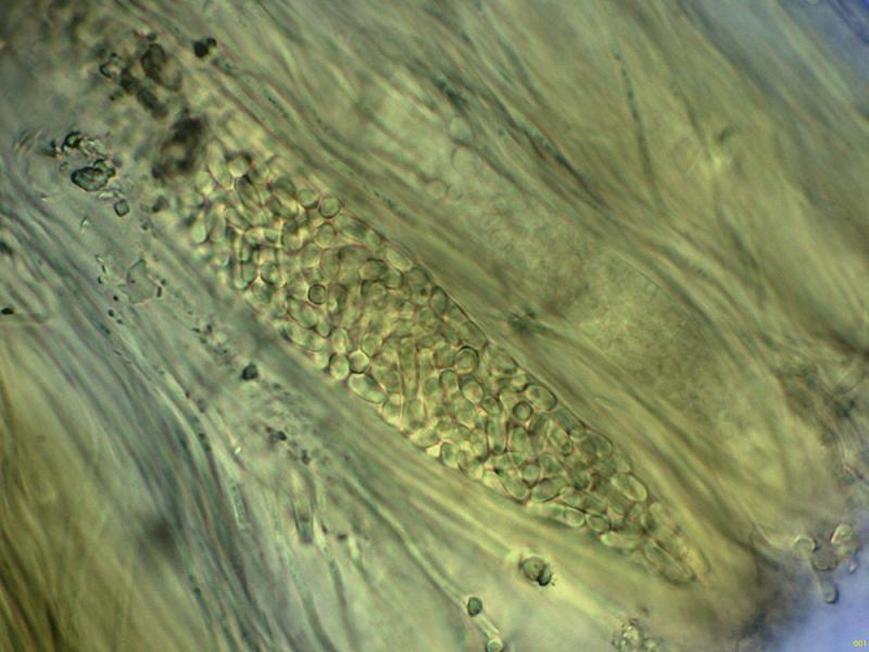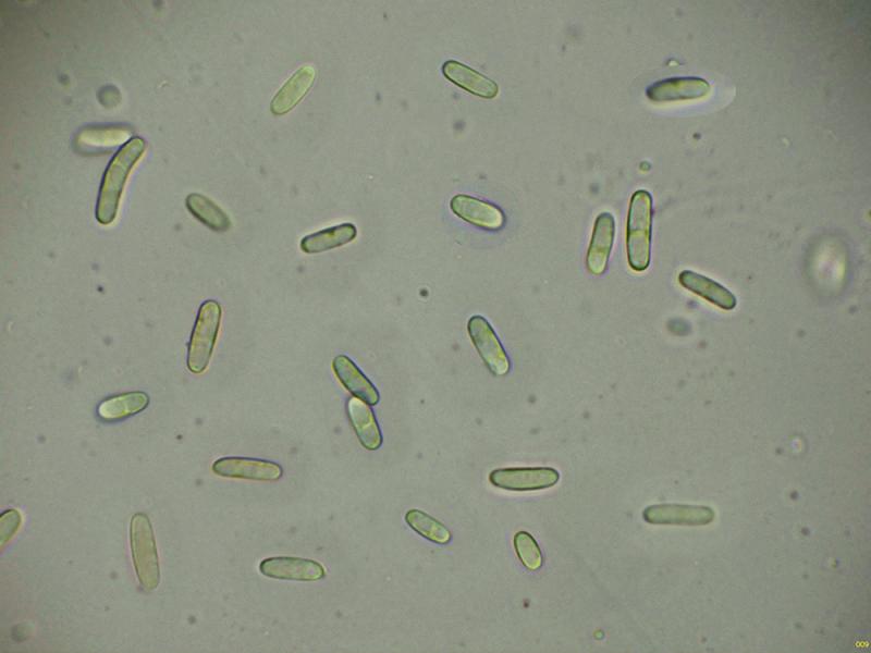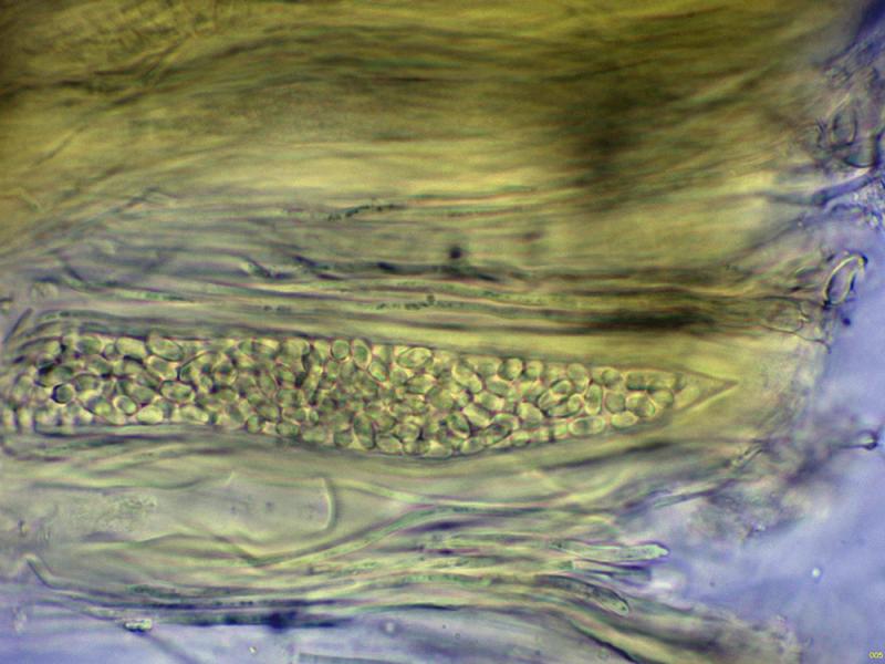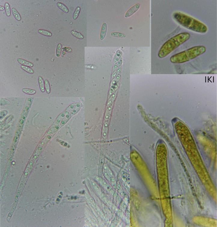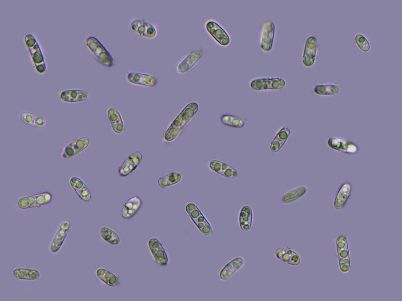 Ascospores, at least within the ascus, are enclosed in a mucilaginous sheath, fusiform, with a prominent central septum and four large lipid droplets inside. The measurements of the free-floating mature spores in water are: