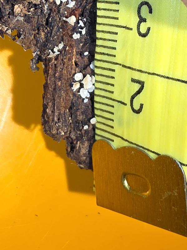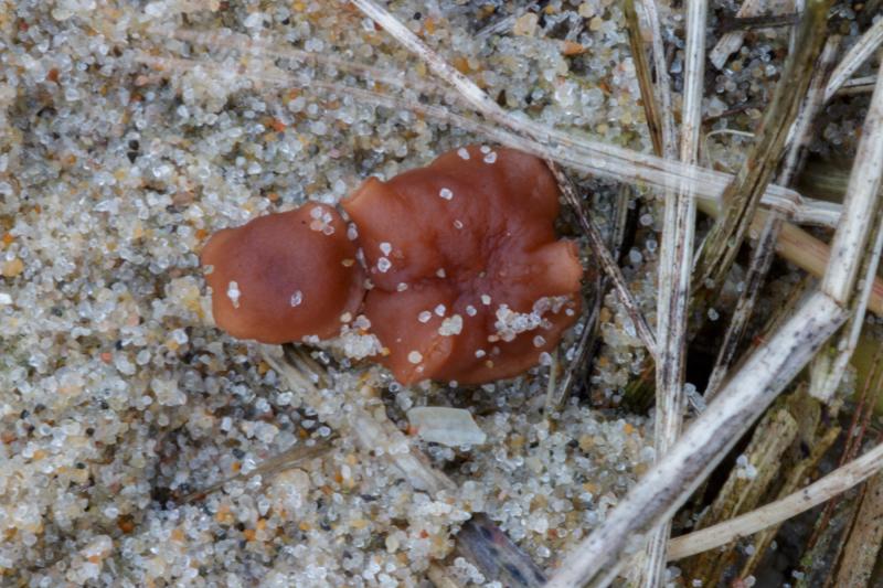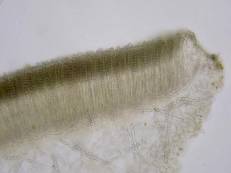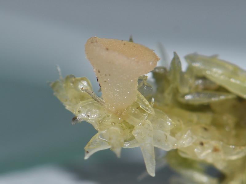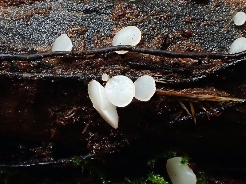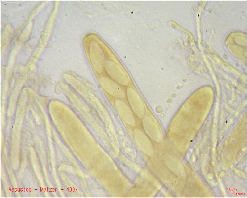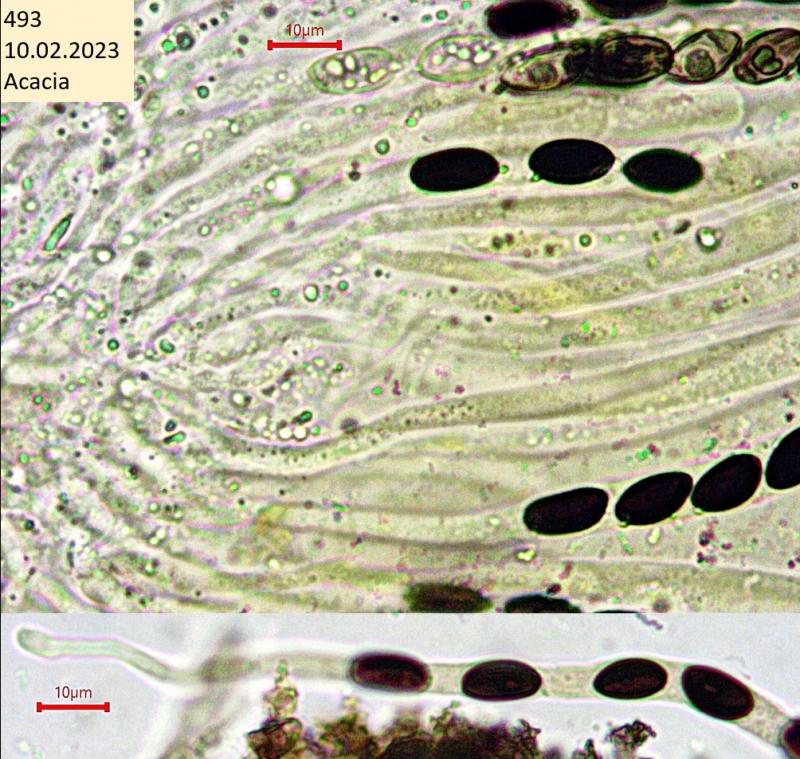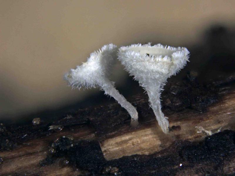 Op donderdag 5 februari vonden we tijdens een inventarisatie deze kleine ascomyceet (0,2-0,3mm). Lijkt erop dat ze staan op ontschorst hout, maar staan naast/op kleine pyrenomyceten(?).