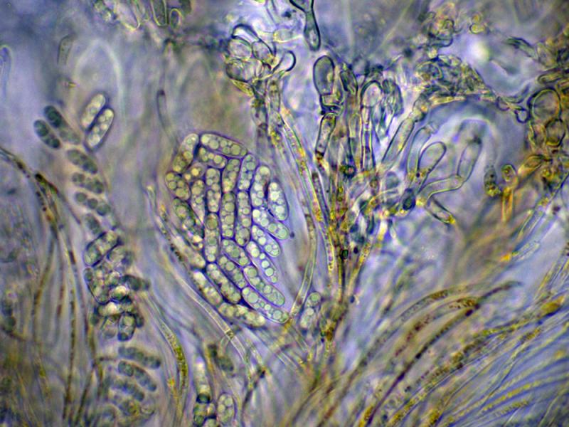 A Pyrenomycete sprouting sparsely but very densely on the surface of small rosemary twigs in decaying soil. The ascomata are mucronate, black grains that burst through the bark, measuring between 0.3 and 0.4 mm. The asci are octosporic and do not react with Melzer's reagent. The filiform paraphyses protrude above the level of the asci, enveloped in a gelatinous matrix.