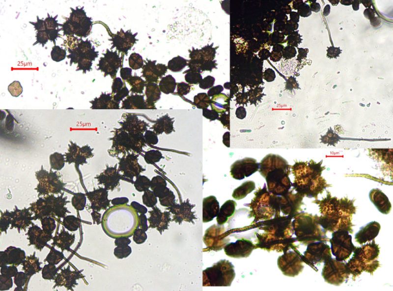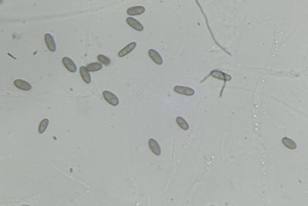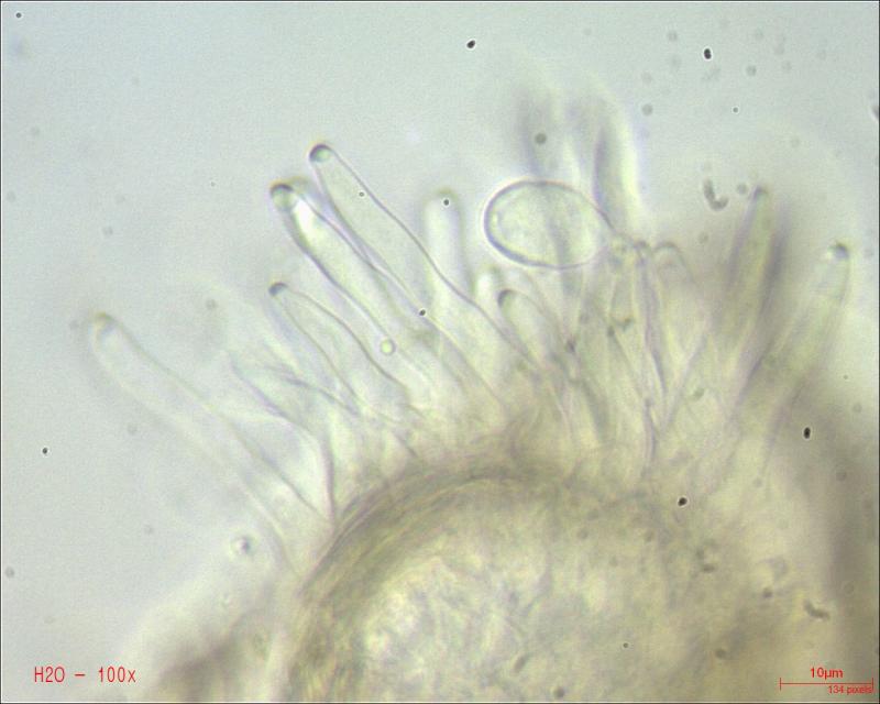 This Pyrenopeziza grew in moist leaves of monocot. (Carex?) in a coastal lagoon in northern Spain. The apothecial margin is very briefly pubescent with short chains of cells with a clavate or broad bullet-shaped terminal element. Asci IKIb asci arising from croziers. Ascospores clavate with a broad obtuse base and a narrower, pointed apex. The lipid content is low or very low, consisting of only a few fine droplets near the poles (OCI=0-1) and remnants of a small apical gelatinous sheath that soon disappears (red arrowed). The paraphyses appear to have very little content and their apices possess an amorphous, almost hyaline or yellowish substance that reacts reddish in IKI. Excipulum textura globuloso-angularis texture of greyish cells.
