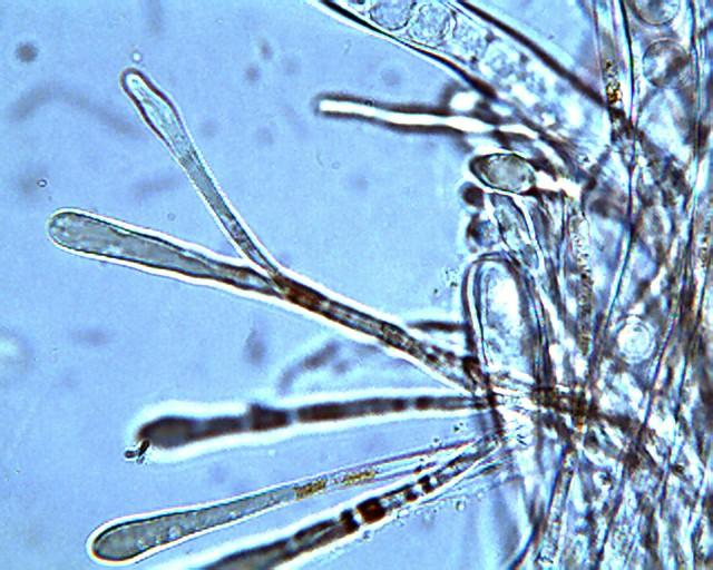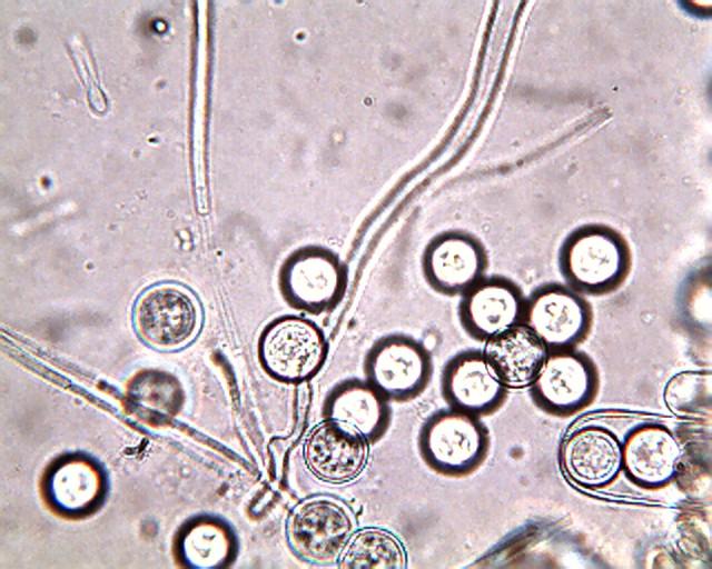 Spores are small fusiform and quite small usually with one or two oil drops at each end, measuring:
