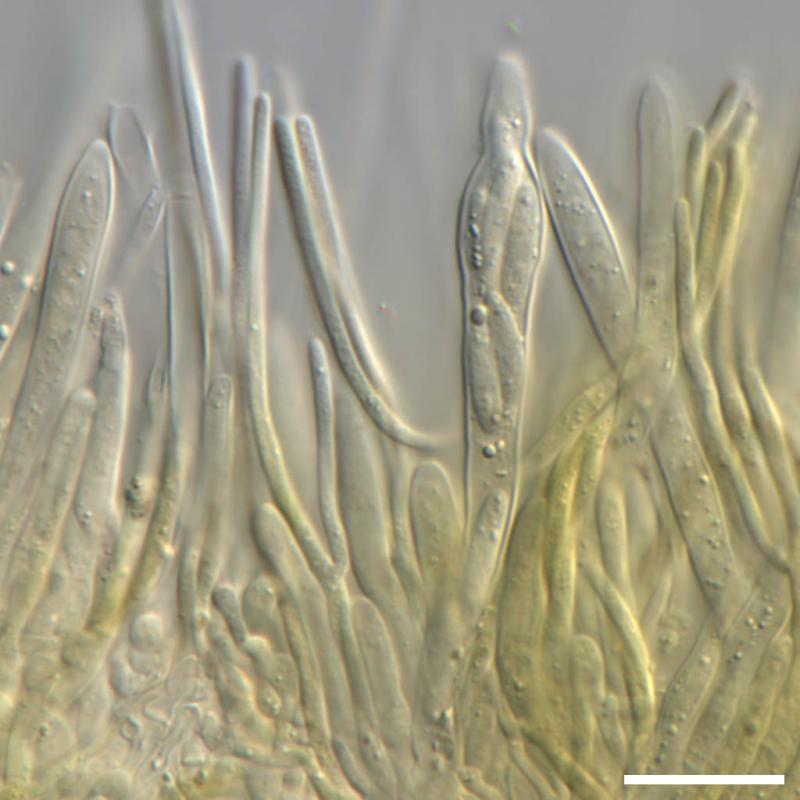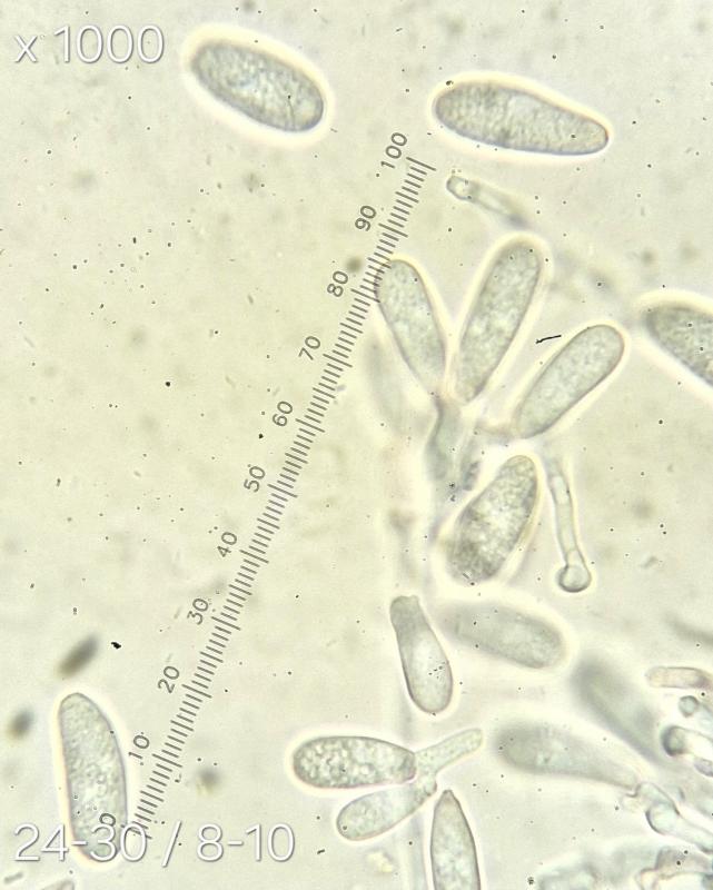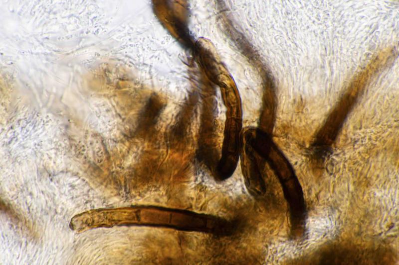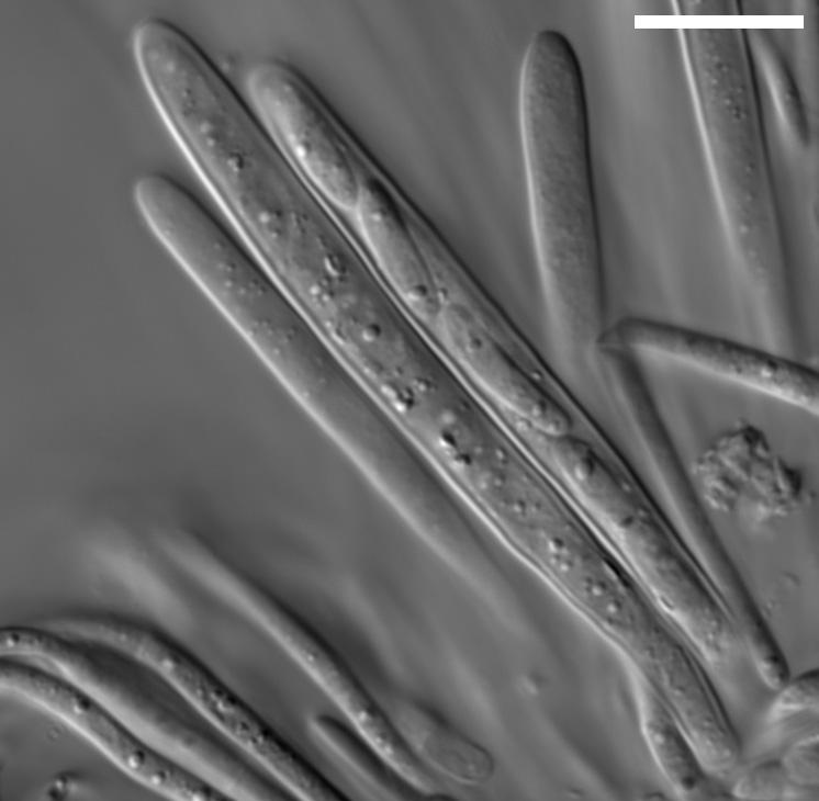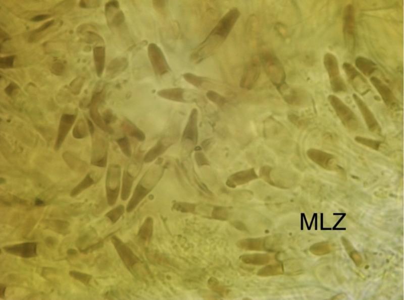 The conidia are brown, very thick walled, multi-septate, and shaped like bowling pins. Sometimes they are curved. There are wavy striations in the flanks of the conidiospores. I am reminded of the conidiospores of Helminthosporium velutinum, but of course that does not produce acervuli like this.