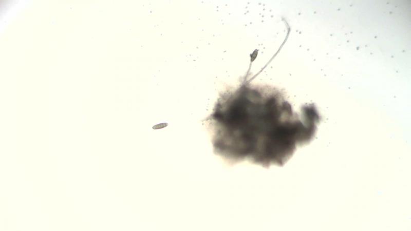 Collected from loamy soil, at waterside (completely wet soil thus )and baited on aquarellpaper,I detected a very small set of fungi, one anamorph, as depicted, and a perithecial fruitingbody assumely the teleomorph.