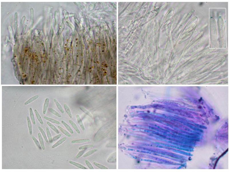 Je m'excuse de ne pouvoir fournir de photos microscopiques de meilleure qualité que ne me permet pas mon vieux microscope. Je ne suis pas équipé non plus de matériel pour pouvoir faire de coupe fine d'une périthèce. Peut-être existe t-il aussi d'autres espèces possibles sur conifères avec ces éléments ? Merci pour vos avis.