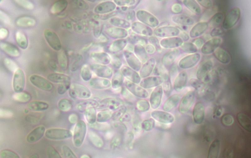 Spores avec deux grosses guttules vers les extrémités et des petites autour, 11,1-14,4 X 3,9-4,4µ.