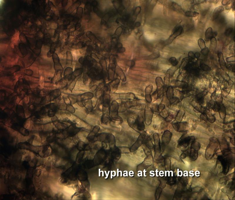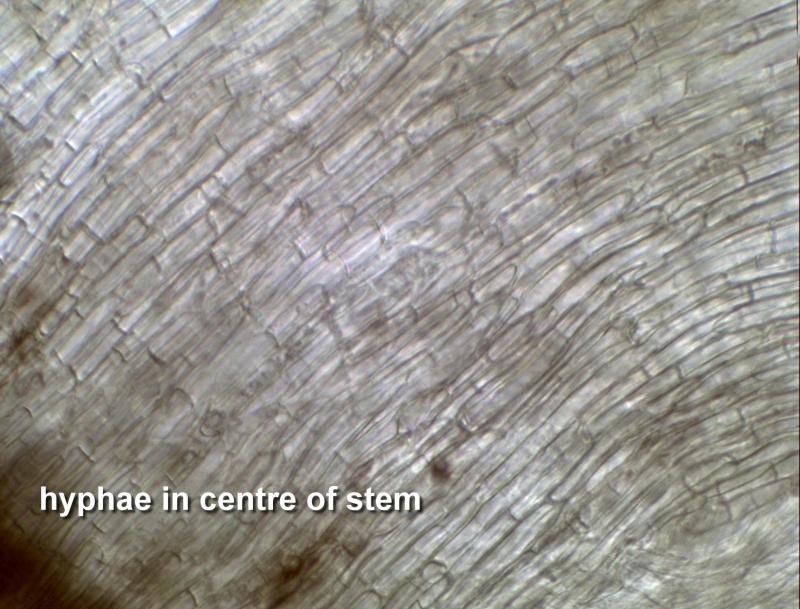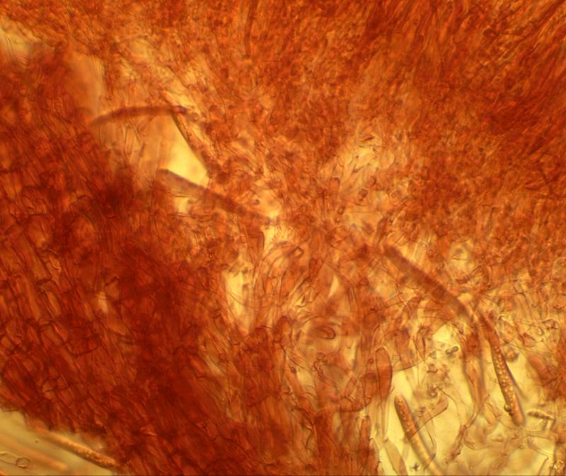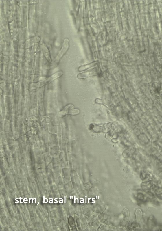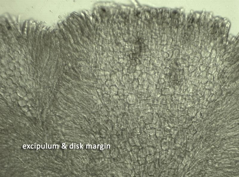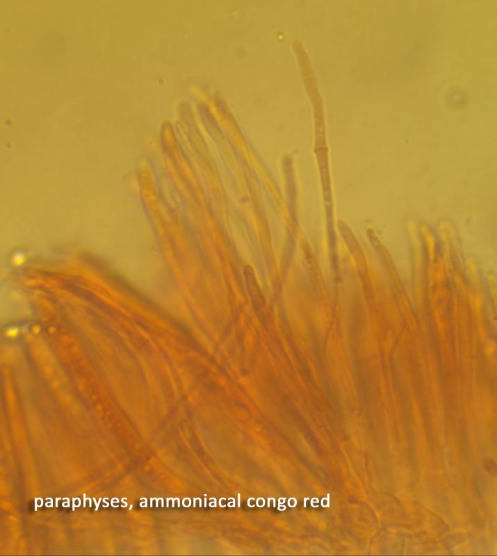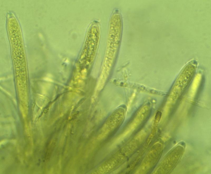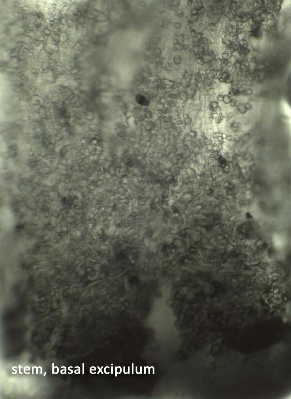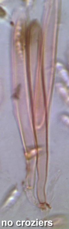 so here are images of the spores (and yes I did see some of the strange ones swollen in the middle also the occasional elongate one (arrowed), the stem cells from darkened base through to regular prismatica in the middle of the stem; also noted was the absence of croziers; the apothecia have not, however darkened particularly on drying - perhaps this develops over time . . .
