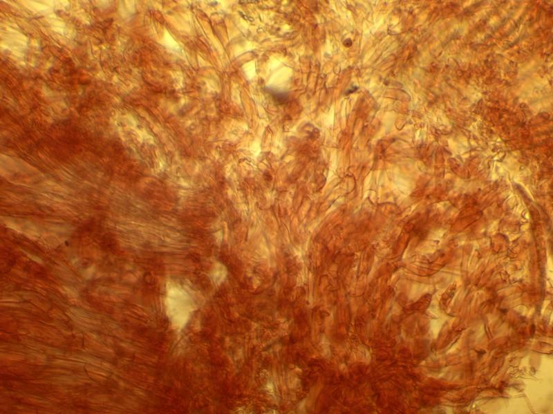 Today I had chance to revisit the collection site and obtained more fresh material so that I could answer Zotto's last question. Here are two photographs of sections of the medulla, which seem to accord well with his "text. intricata with intercellular space?". They show the medulla with the continuation of the textura prismatica of the stem on the left and (just visible) the bases of the asci at top right (stained with ammoniacal congo red).
