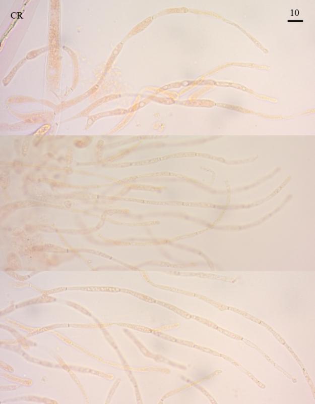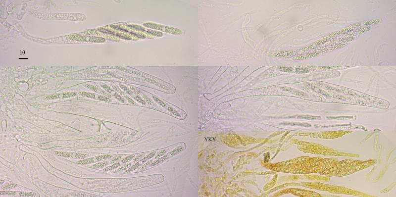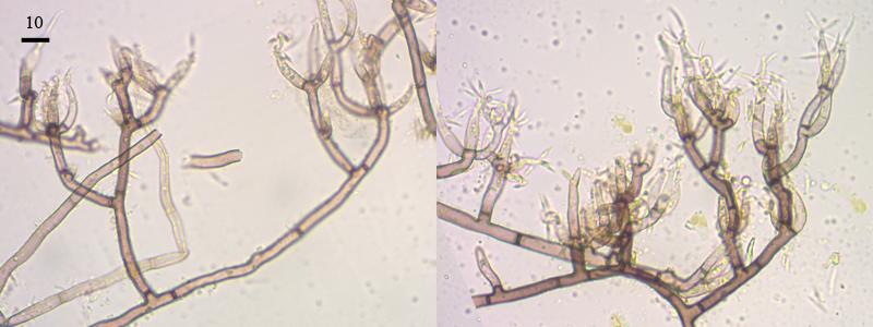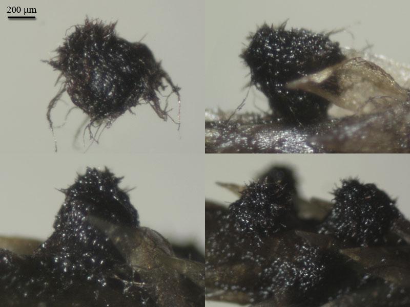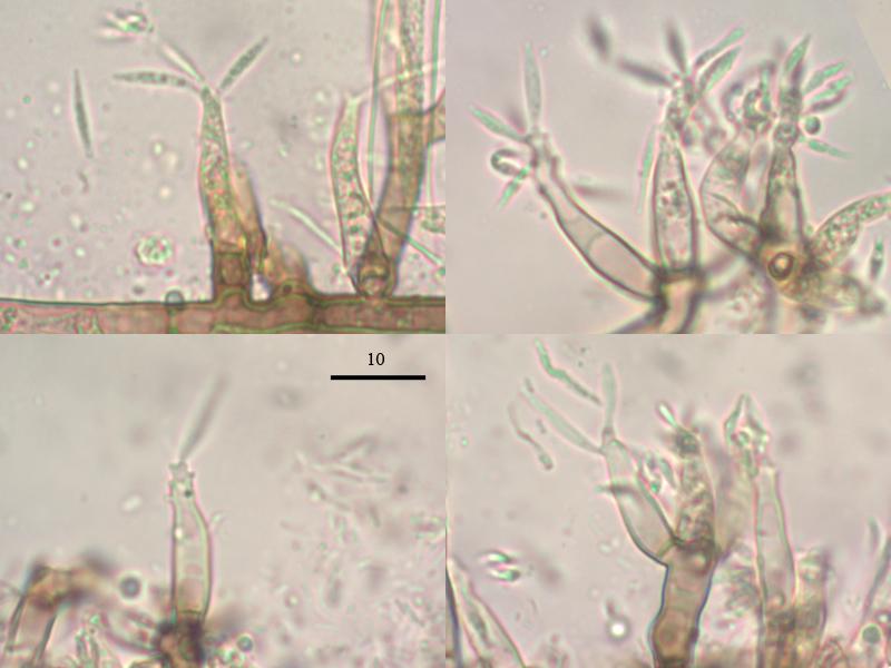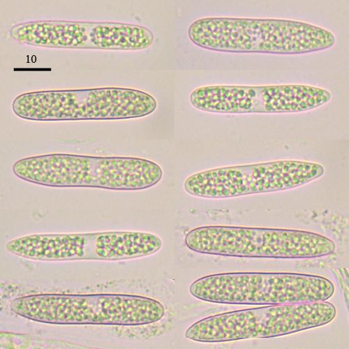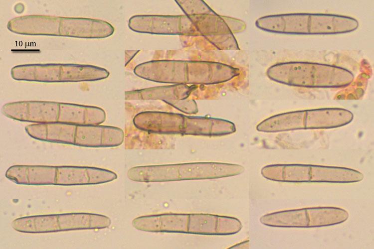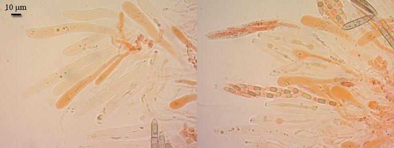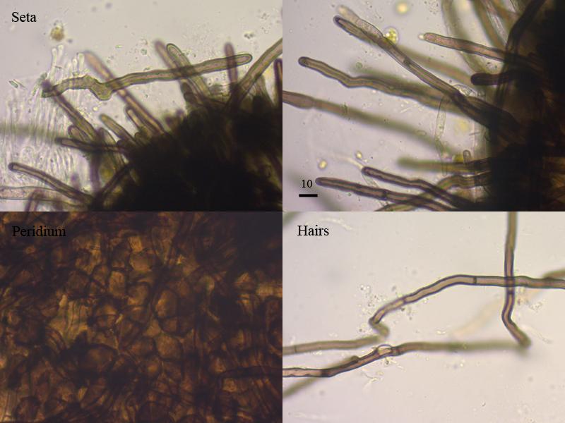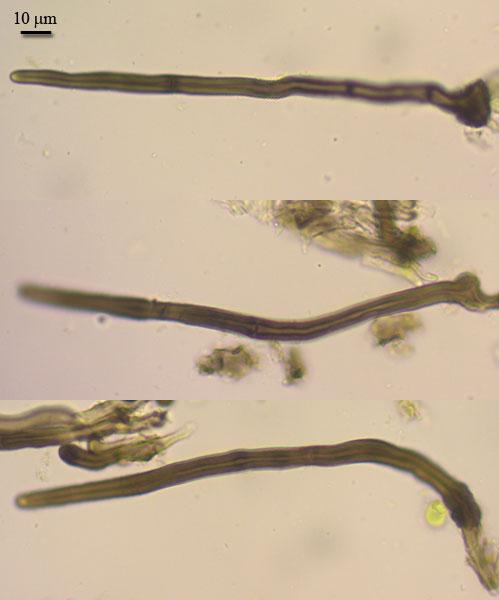 Perithecia globose to pyriform, to 700 mk high, 500-600 mk broad, site among dense weft of brown hyphae on sphagnum branches; dark brown, almost black, upper part setose, base with abundant hyphae, walls firm; all plant (sphagnum) becoming black and firm to the touch. Asci cylindrical, to 200 long, 15-20 broad; paraphyses cylindrical, segmented, 2-3 broad; spores cylindrical, becoming brown in asci, with 1-3 septa, gututlate, 36 (31-41) x 7 (5,5-8,8) (N=20).