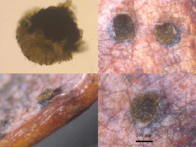 Apothecia pustulate, greenish, bursting through epidermis (base deepened in leaf tissue), 150–220 mk in diameter, 50 mk thick; several apos nearby at one leaf.