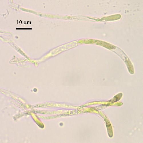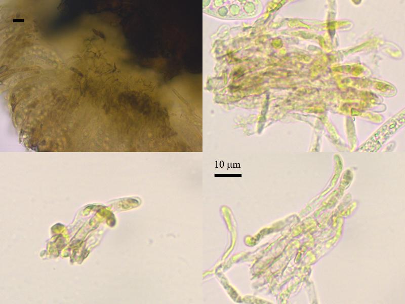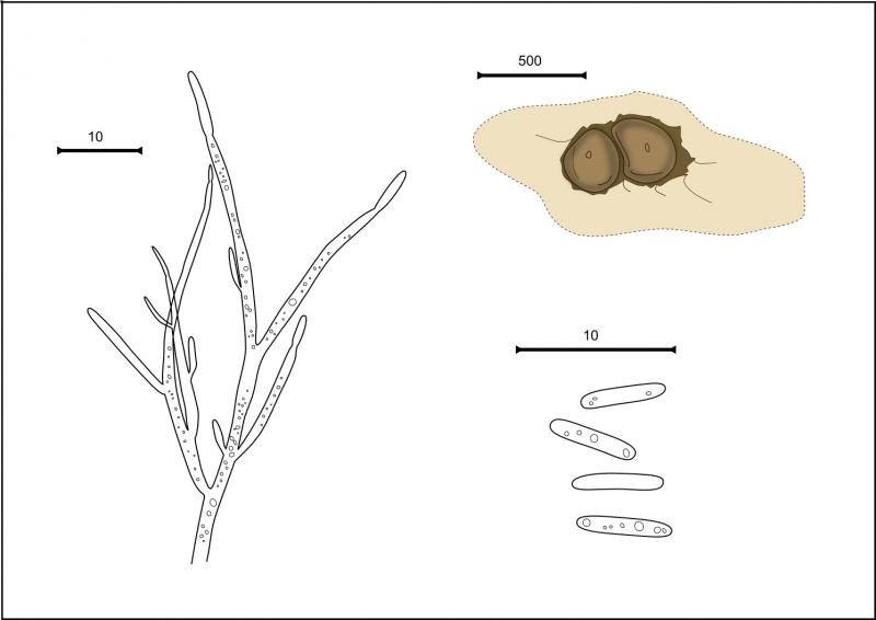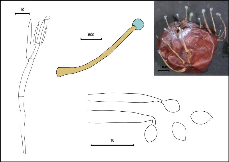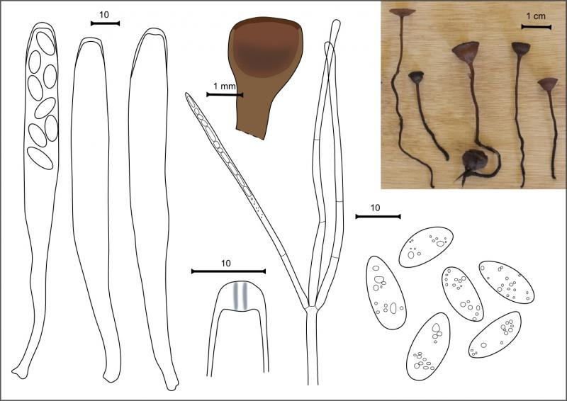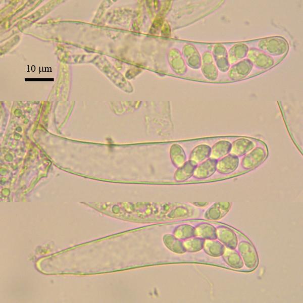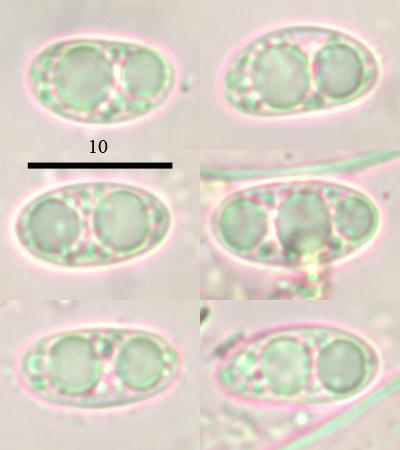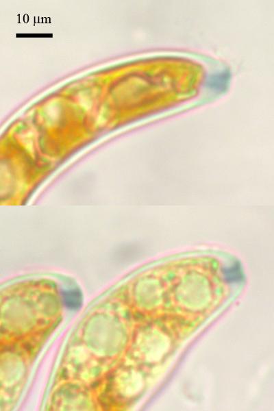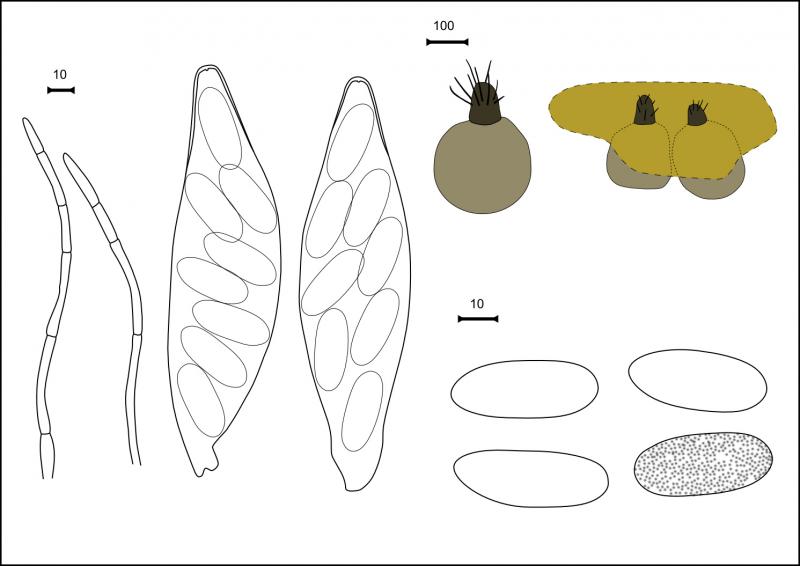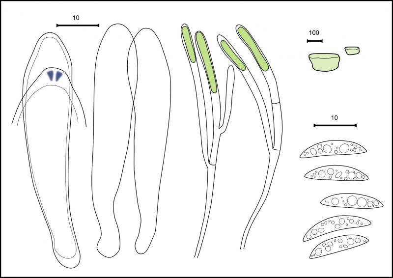 Excipulum very scarce, at base from irregular brown cells, and at upper part from prismatic, end hyphoid cells to 25 long and 3 thick, filled with greenish vacuoles; asci clavate, clampless, with euamyloid ring, about 82 x 15; paraphyses cylindrical, with obtuse tips, filled with greenish content (dead in studied specimen since drying in situ), about 73 x 3.7; spores ellipsoid, slightly heteropolar, with many round oils, 10.7 (10–11.8) x 5.7 (5.3–6) (n=12).?