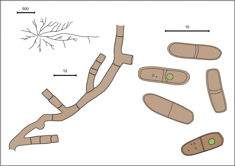 Thomas LæssøeSpores brownish, typically 4-celled; 26.8 x 2.4;