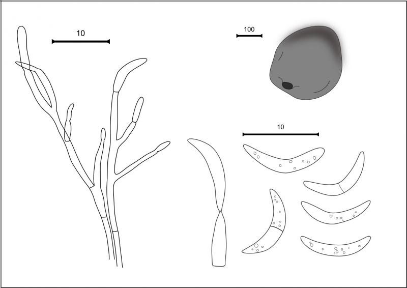 Next imperfect species is forming sporodochia: disc- to cushion-shaped dark brown bodies. Richly branched conidiophores crowded inside, forming rod-shaped conidia.