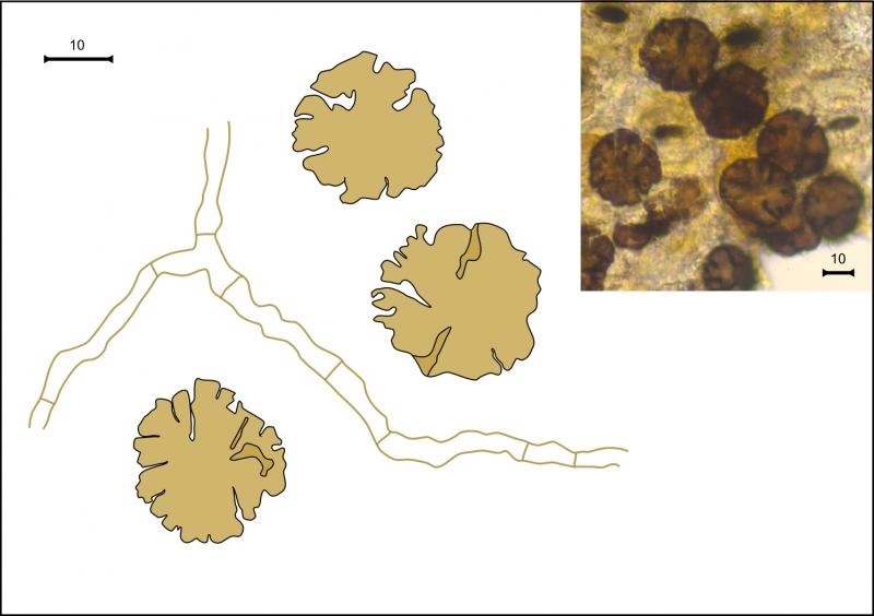 The last one constantly met is somehow doubtful, probably it is not anamorph but undeveloped stage of some species. It composed from round lobed rosettes, brown and thick, surrounded by brown hyphae.