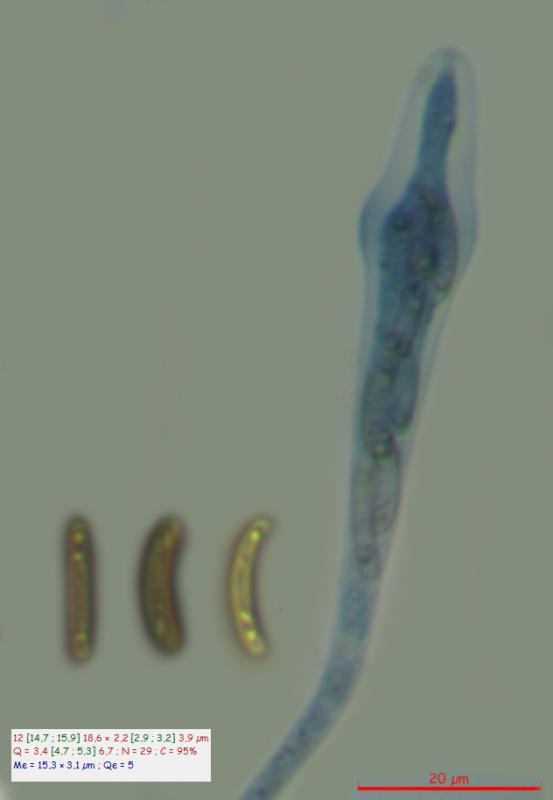 Bonjour à tousJe vous soumet ce champignon trouvé sur une branchette de Fraxinus excelcior. Les périthèces font 0.5 mm de diamètre et les spores font en moyenne 15.3x3.1 microns. Les asques sont legerement enflées à leurs extrémités.