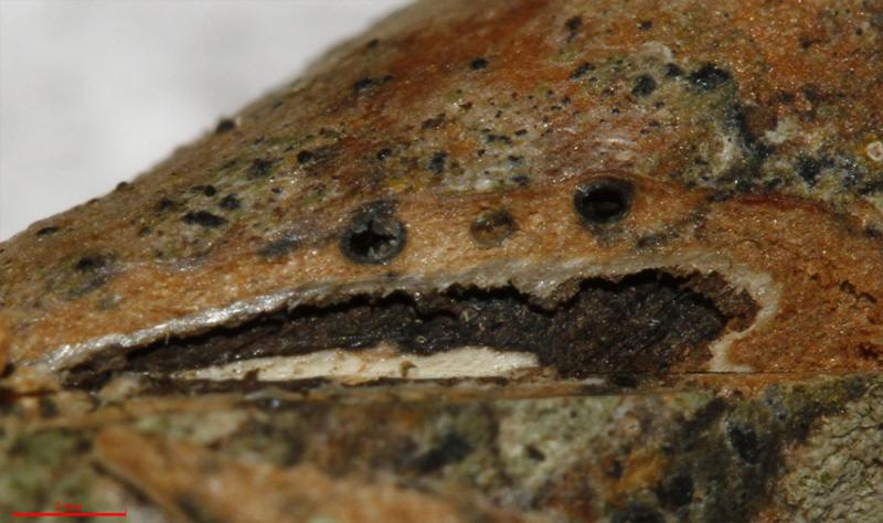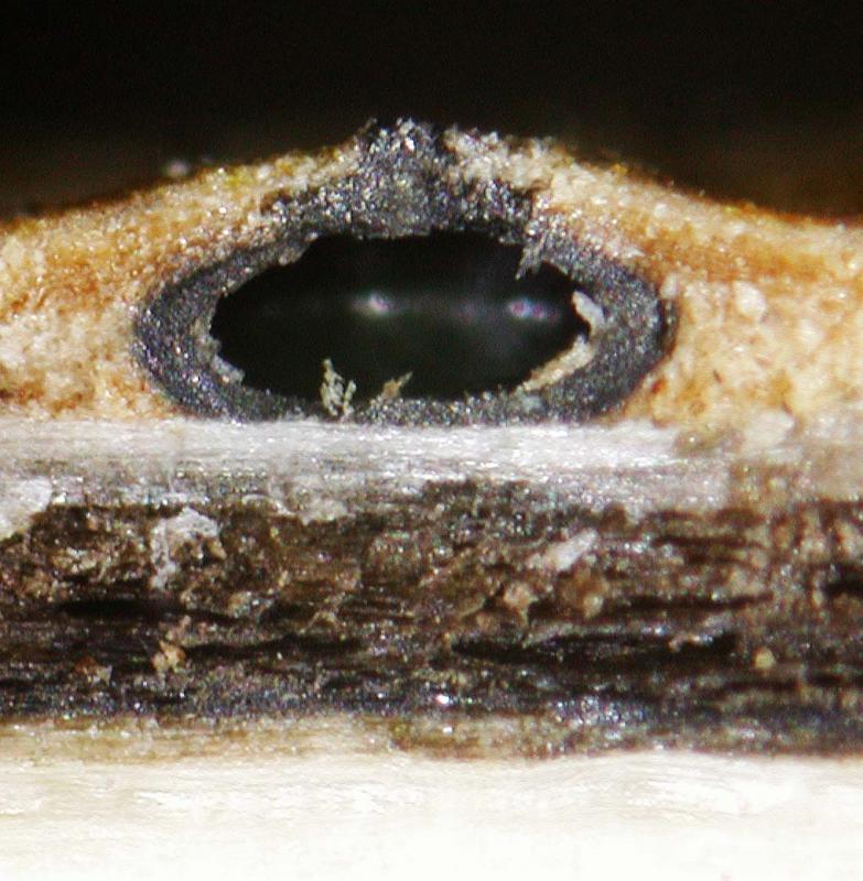 Au lieu de faire une vague section oblique dans l'écorce je te suggère de fendre la branche dans le sens du fil avec un sécateur, en passant au milieu de la colonie. Ensuite tu rafraichis la face verticale de la coupe avec une lame de rasoir neuve, jusqu'à ce que tu puisses observer un périthèces coupé verticalement par le milieu, comme sur la photo jointe. Tu peux y voir en un coup d'oeil que les périthèces sont séparés, situés juste sous le périderme percé seulement par l'ostiole et situés sur une couche de tissu noir qui colonise la partie basale de l'écorce, c'est à dire tous les caractères du genre Cryptosphaeria. Ensuite l'hôte et la dimension des spores te mènent facilement à l'espèce, c'est un genre pas trop compliqué.
