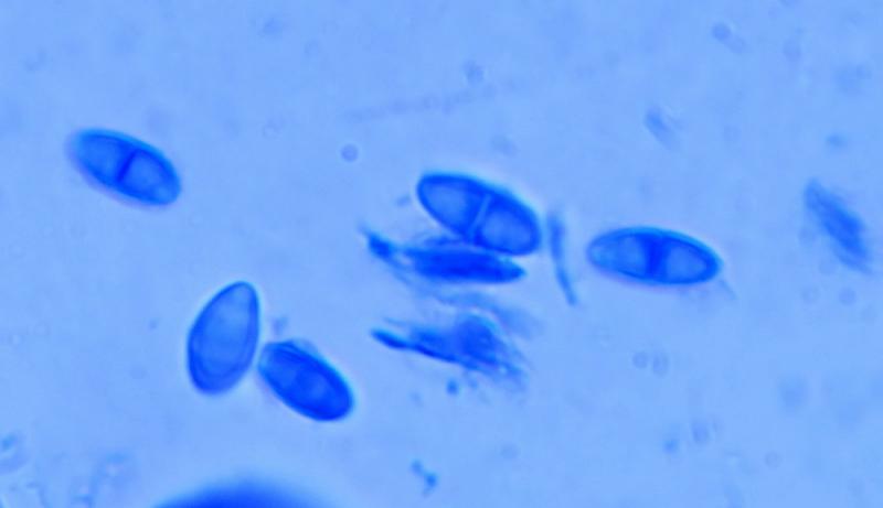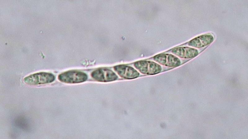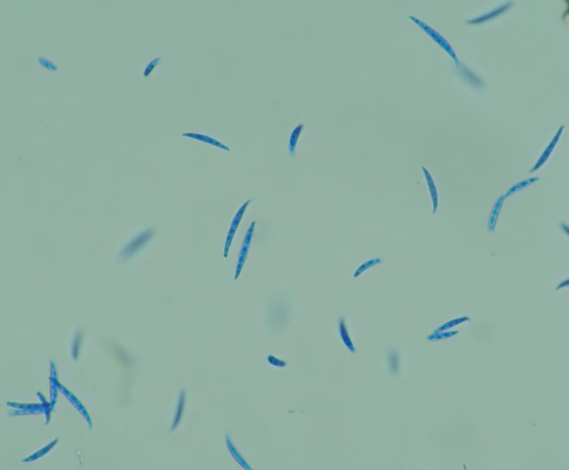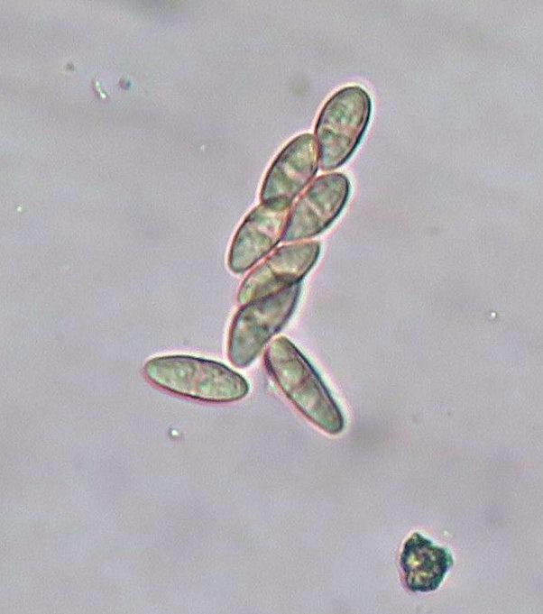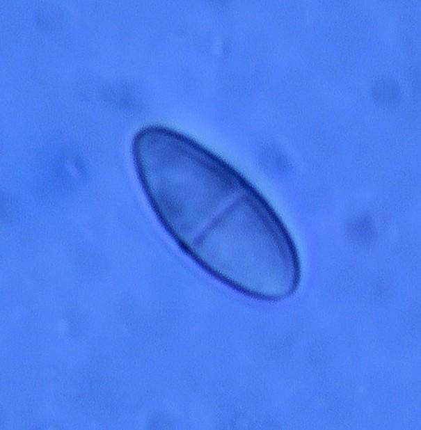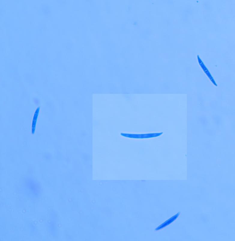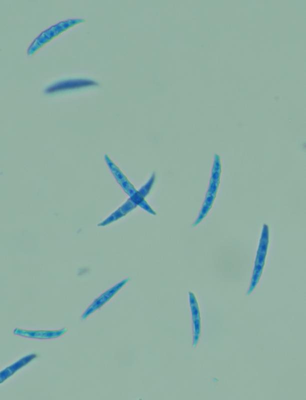 Spore shape: Fusiform to navicular with a constriction at the central septum