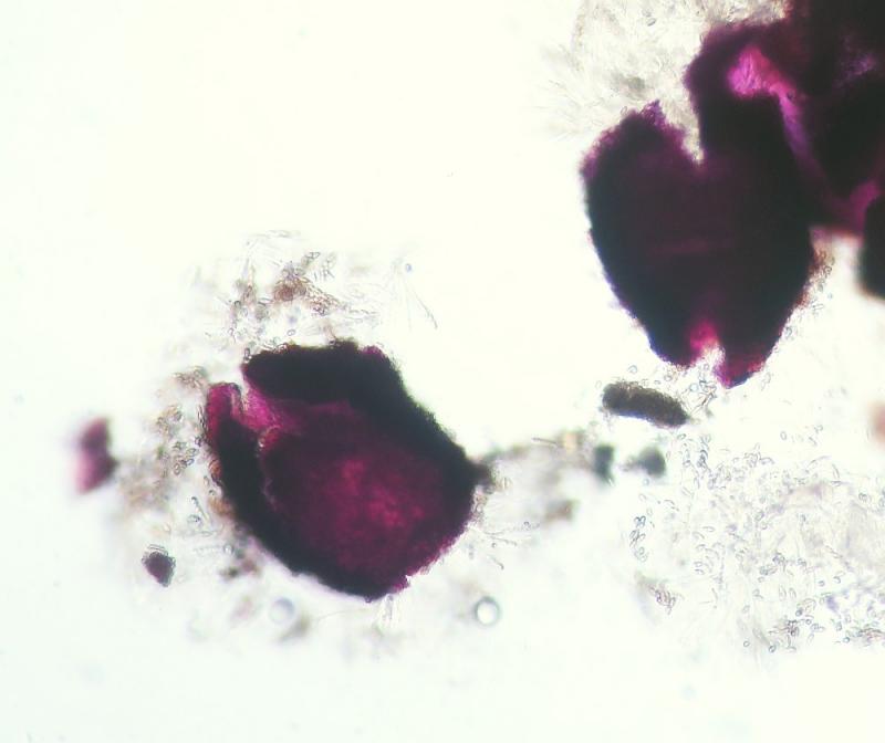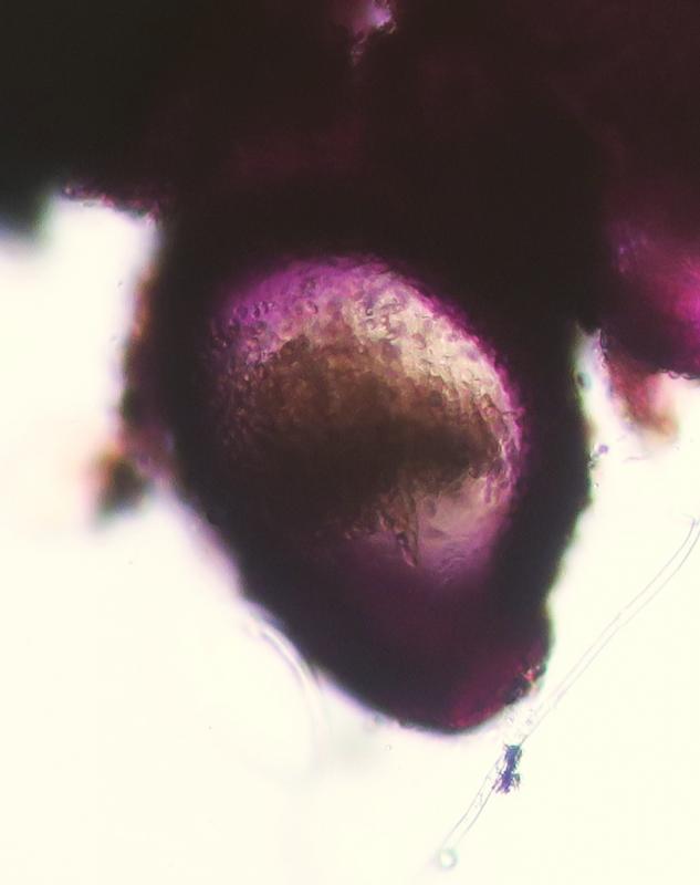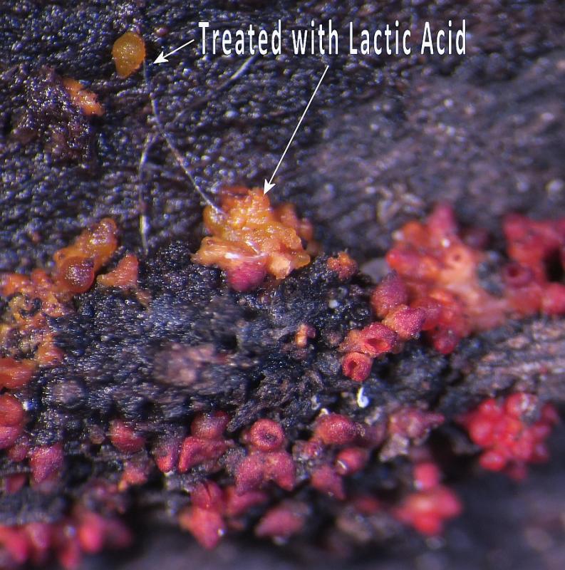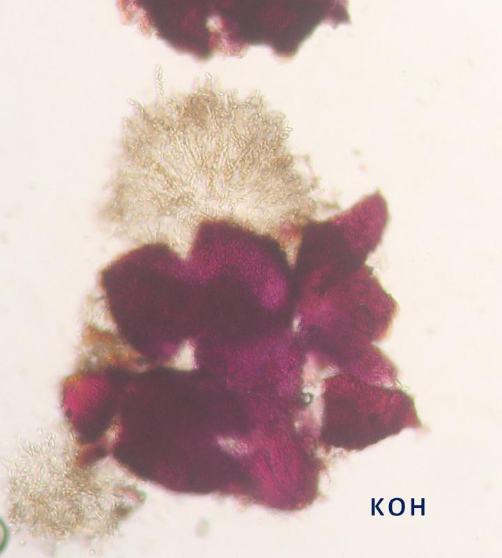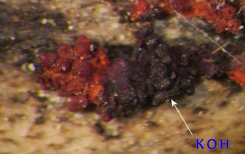 Acocarp colour: Bright red, then blackening when old; purple-blue in KOH, orange-yellow in lactic acid