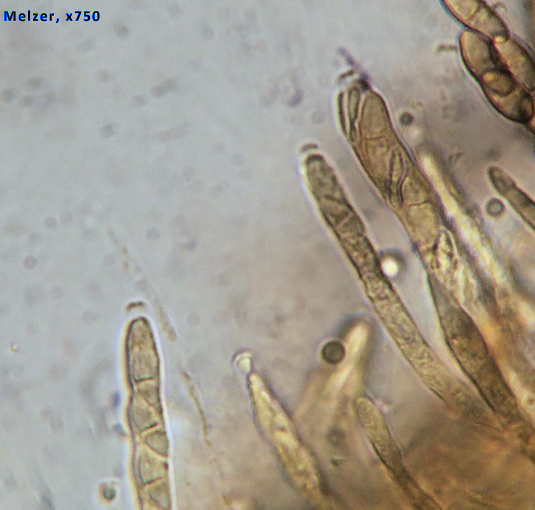 Asci: cylindrical to subclavate, slender, slightly bent ot curved, tapering gently towards the base.