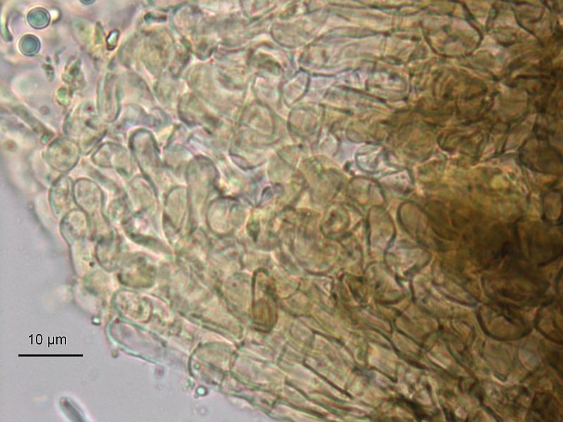 This vacuolar body dissolves when KOH is added. You should do that and observe while the vacuolar body dissolves and whatch wether there is a yellow reaction or not. This is an important feature to key Mollisia species.