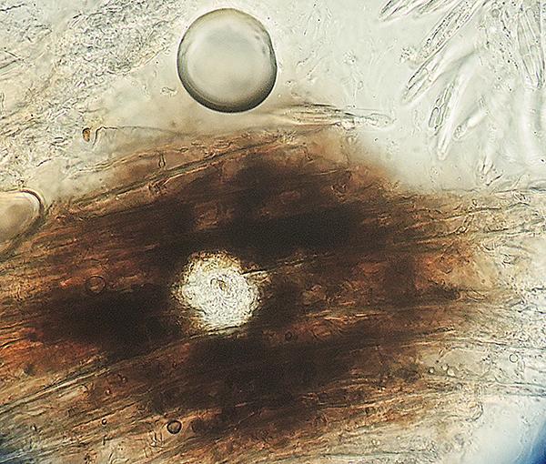 Tiny immersed pyrenomyces appearing as black specks on surface of stem; tiny (!) frb below. Non beaked. Asci non-loosening, in gelatinous, dissolving hamathecium. Ascus apical apparatus very prominent, base drawn into thin stipe, ca. 50-60 x 8 µm. Spores hyaline, slightly falcate-fusiform, with two large drops making them appear pseudoseptate, 22-30(-35) x 2-2.8(3) µm. without appendages or gel.