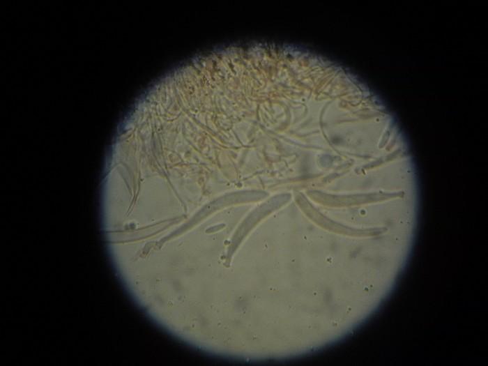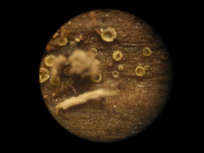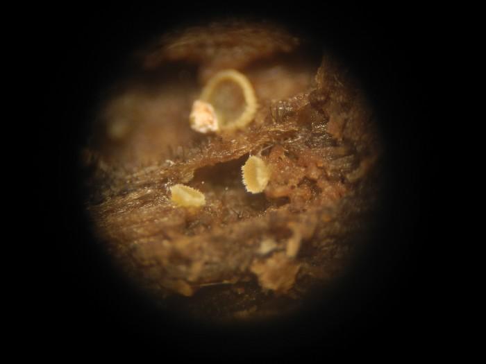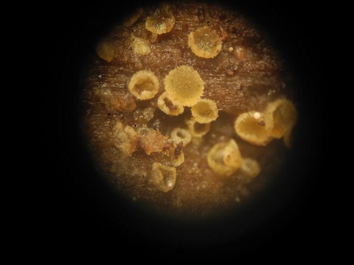 Hier j'ai récolté cette colonie de petits disco jaunes et marge ciliée, diam 0,4-0,5 mm, sessiles.