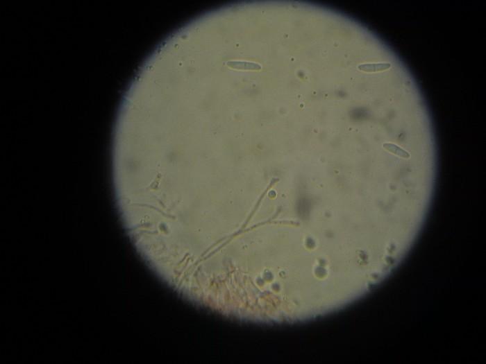 Spores hyalines 1-septées, 2,2-3,5 x 10,6-11,5 µ, un peu arquées.
