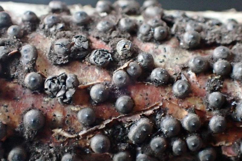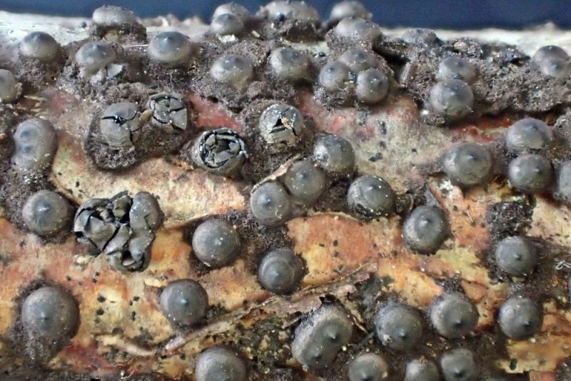 Périthèces globuleux, isolés à plus ou moins grégaires, sphériques, surmontés d'une ostiole, à paroi luisante et fragile, reposant sur une sorte de subiculum noirâtre.