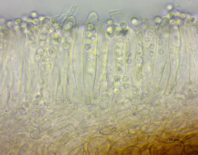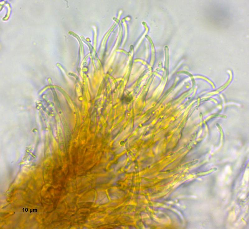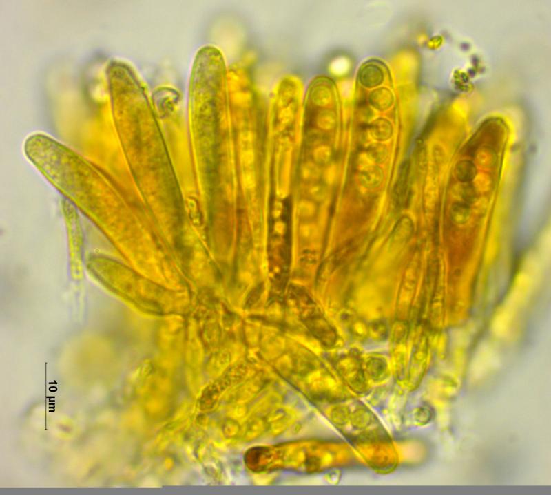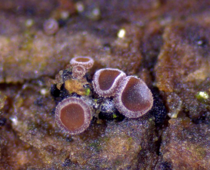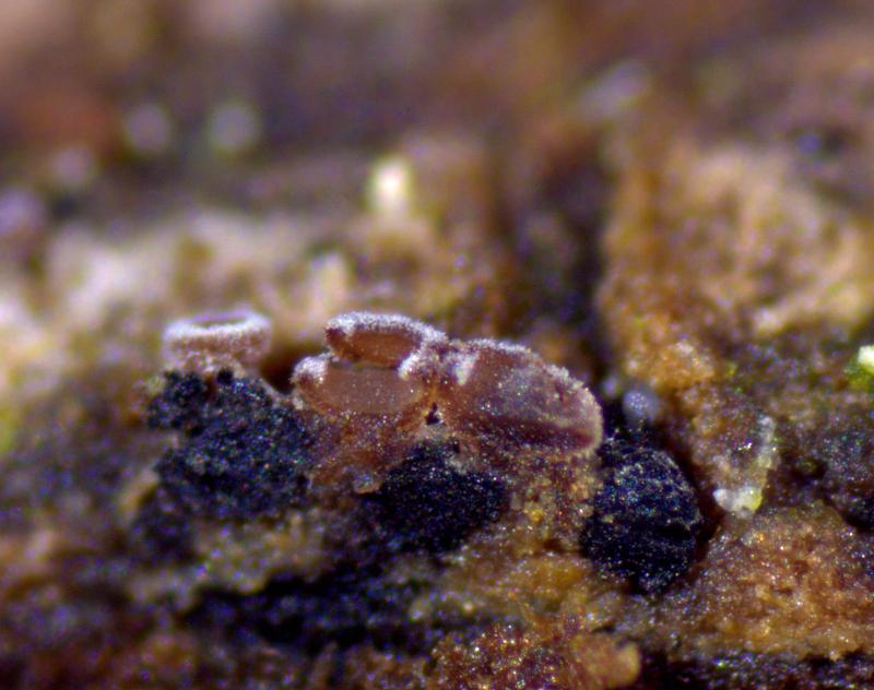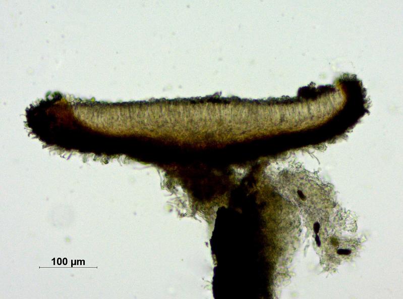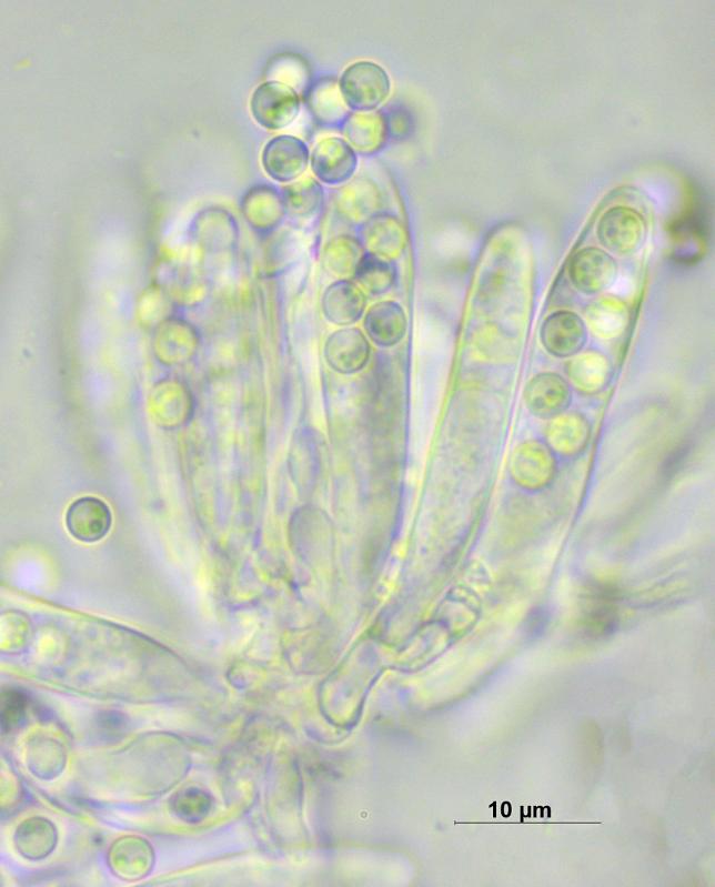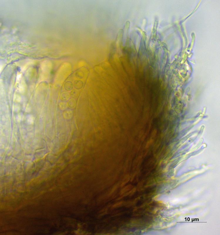 Trouvé sur branches mortes de Berberis vulgaris, colonisé par Cucurbitaria berberidis (pâturage boisé à 845m), apothécies 0.25-0.5mm de diamètre, surface externe couverte de poils en crochet, renflés à la base, hyménium rouge-brun, asques à crochet 35-47x6.5-8µm, octosporés, IKI-, spores lisses, sphériques 3-3.9µm.