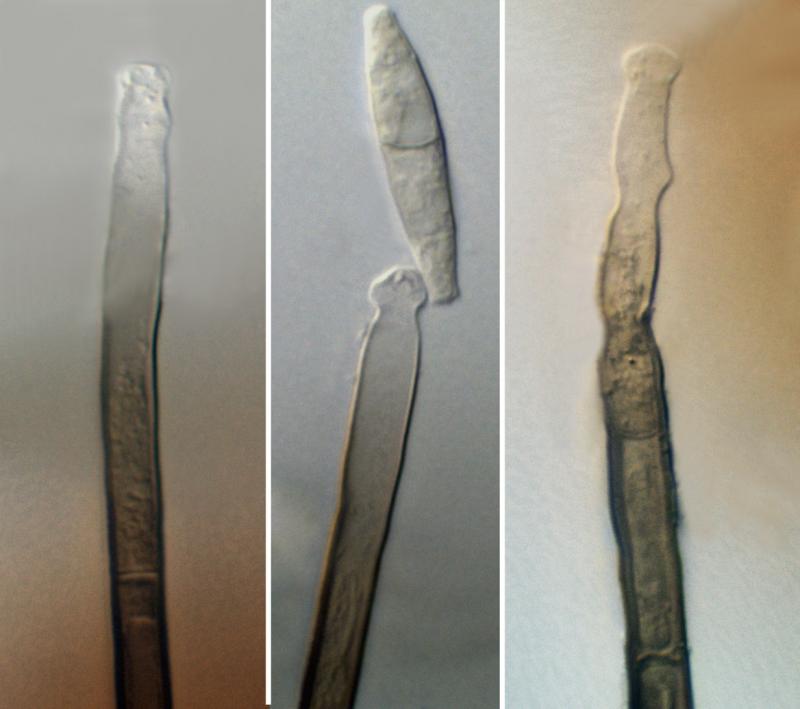 * conidia with truncate ends (sometimes a central point/hump can be seen - arrowed)