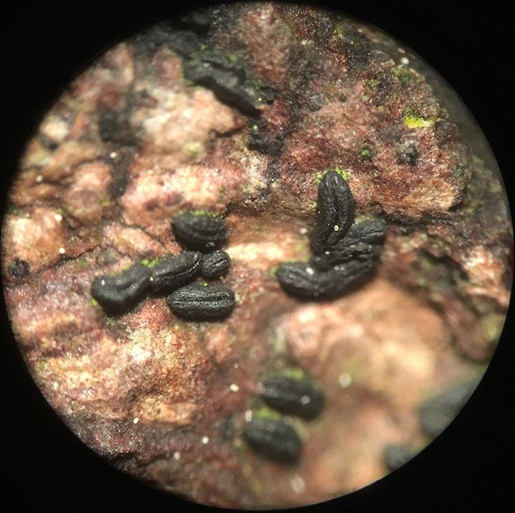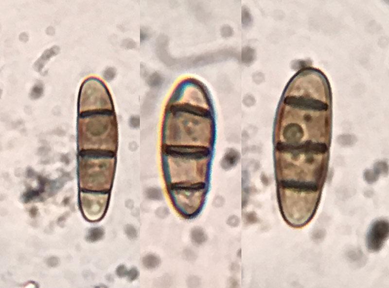 From Bronx NYC, Pelham Bay Park on Picea. Am I correct that this is Hysterium pulicare? Ascospores are brown, 3-septate, (18) 21-24 by 6-8µm. The end cells of most spores are lighter brown (a few almost hyaline) than the median cells.