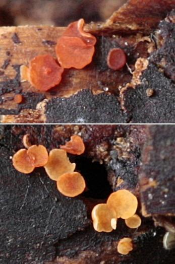 Apothecia sessile, less than 1 mm wide, white to yellowish, oxidating to wine red.