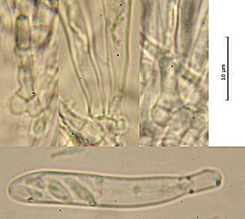 Hello,this seems to be very close to Calycina conorum, except that I found different data about amyloidity too (IKI+red in M.Hairaud's article or on asco-sonnenberg.de web). Is there some variability like in Lachnellula? Or is this another species? (I don't think my Lugol is diluted - it's only half year old and on some Lachnellula sp. on the same day showed the red reaction very well.)