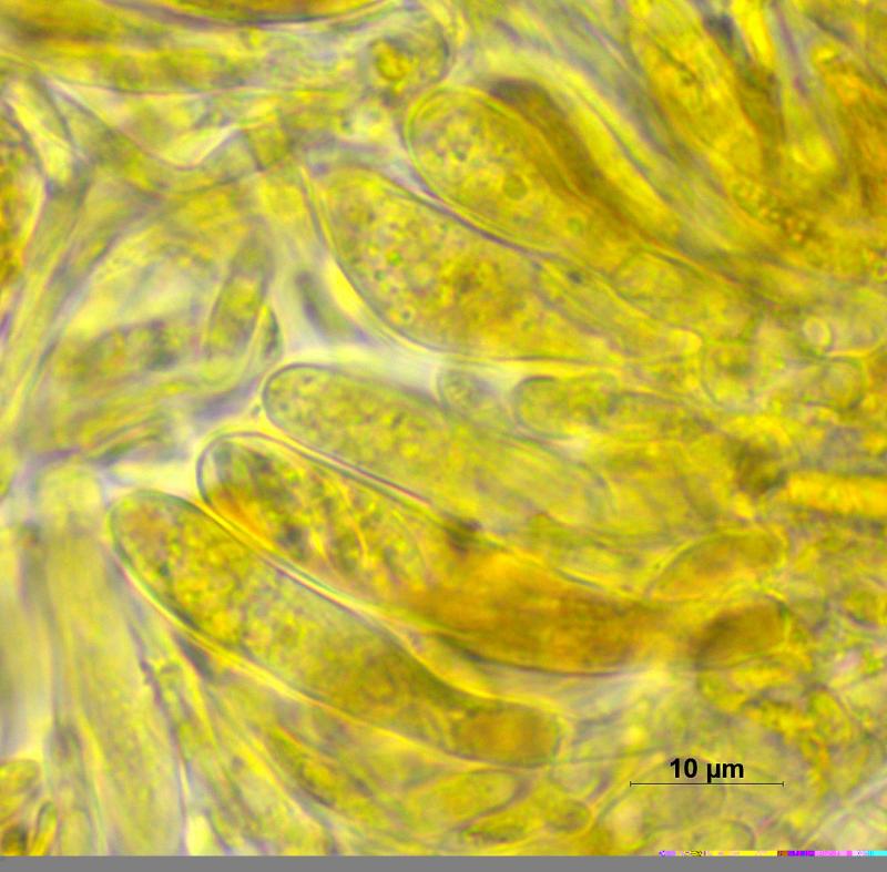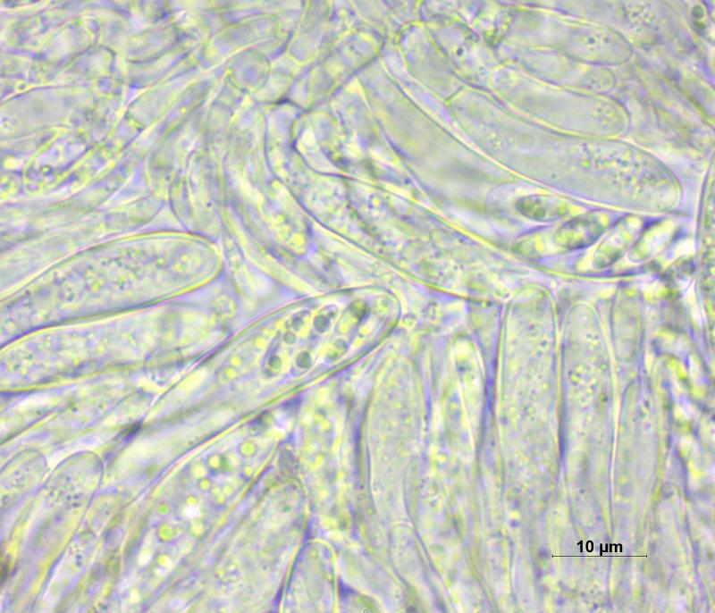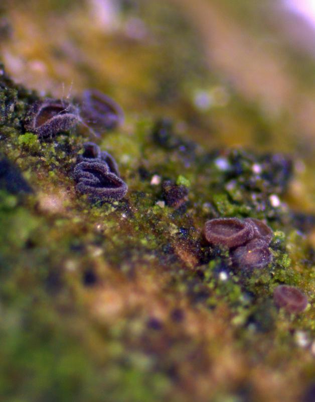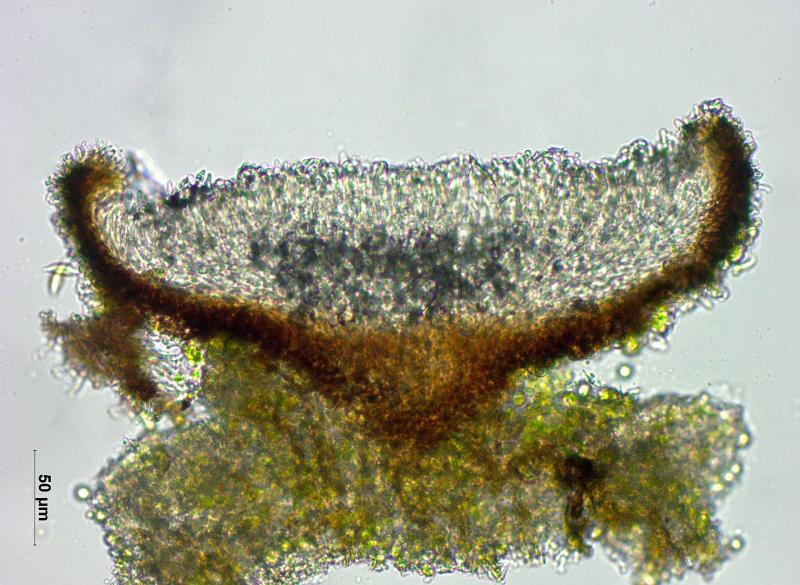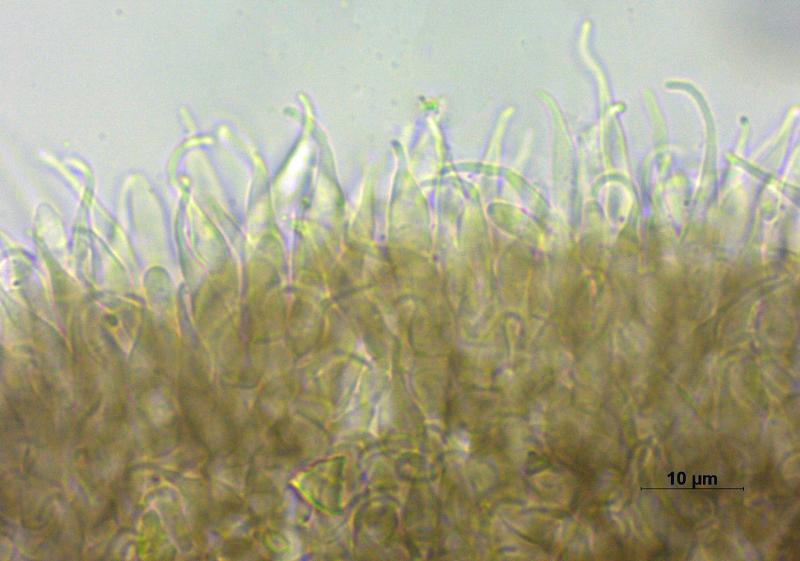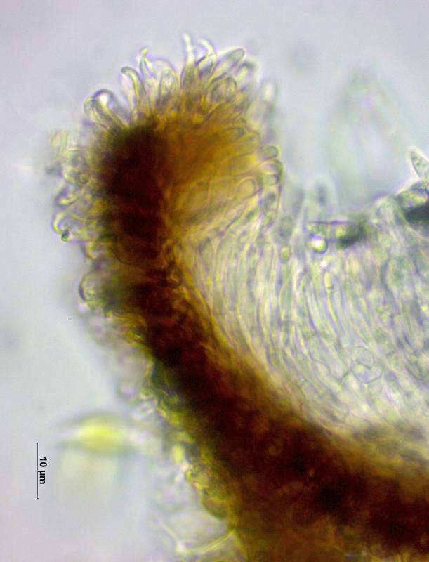 Trouvé sur branche morte et décortiqué d'Abies alba (au bord d'une zone maregageux à 1'010m), apothécies 0.15 - 0.4 mm, stipitées, surface externe et marge densément couvertes de poils, hyménium rouge-brun, asques 32 - 45 x 6.5 - 8 µm, avec crochets, octosporés, IKI-, spores 7 - 10 x 2.1 -2.8 µm de diamètre, paraphyses dressées et pluriseptées, poils à la base épaissie et bombée, le sommet mince et courbé en crochet, jusqu'à 20 µm.