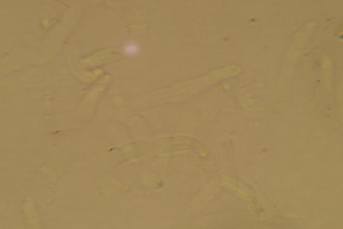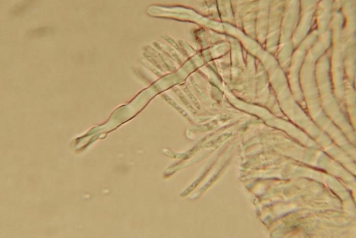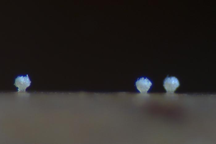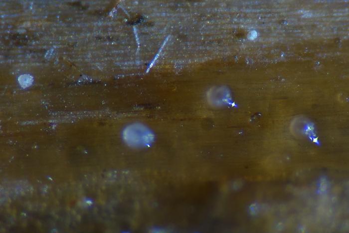Then I tried heating it a bit longer so that it bubbled for a few seconds. This time the glassiness had clearly gone and at 400X the hairs were almost invisible. Hopefully the fruitbodies start producing spores at some stage.