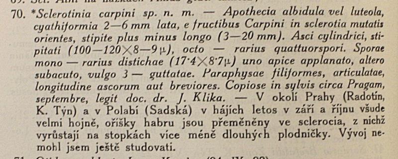 The text in czech says: "In the vicinity of Prague (Radotín, Karlštejn [?]) and in alluvium of Labe / Elbe (Sadská), in groves, this september and october, everywhere very abundant. Hornbeam nuts are changed to sclerotia from which the fruitbodies grow on more or less long stalks. I didn't have the opportunity yet to study their development."