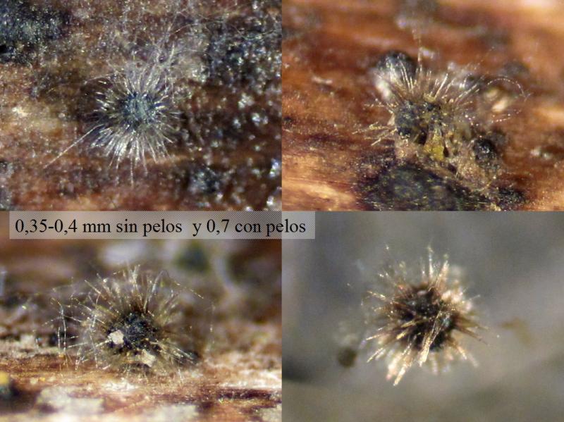 Pelos gruesos oscuros de 200 * 10 micras y otros mas finos de unos 300-400 * 4 micras