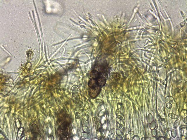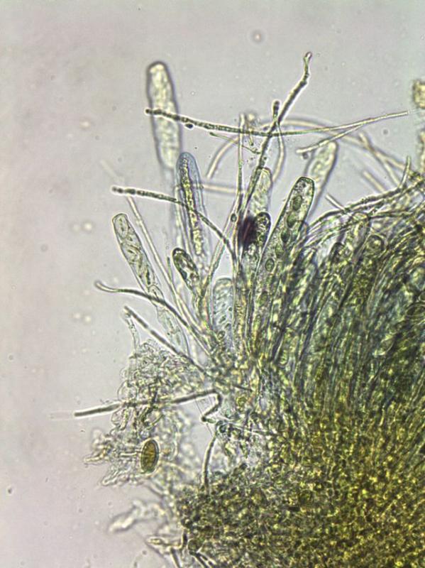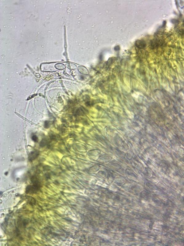 Very striking is the bright yellow mucus layer in which the tops of the paraphyses curl over the ascis.