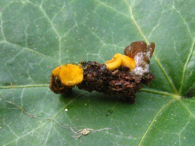 On a forest path we found many fruit bodies of Cheilymenia theleboloides f. theloboloides on waste including probably chicken manure. On the same substrate I found one fruit body that resembles a small peziza but ultimately is an Ascobolus.