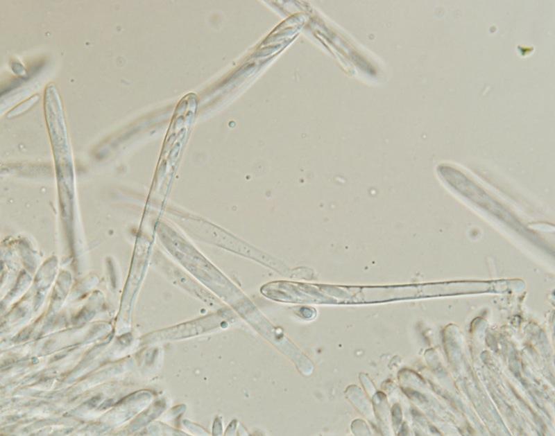 this discomycete is unknown to me. It grows on a stem of Paeonia next to Lophodermium paeoniae. The inconspicuous ascomata have a fine, darker margin/excipulum which is nicely seen under the microscope. The ascospores measure 7.5–8.5 x 2.2–2.5 µm. The asci have croziers, the apical apparatus is strongly blue in Lugol. The paraphyses are widened at the apex and don't have any remarkable content.