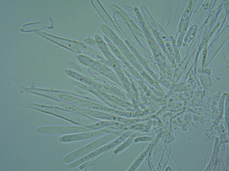 The collected material, a piece of wood with the fungi, was kept at about 20 degrees centigrades under moisty conditions and a preparation was made from a fresh apo. I covered the preparation with a slip and less pressure was applied compared with my earlier preparations.