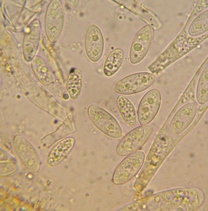 Ascospores : 13-16 x 6-7 µm, elliptiques, à extrémités plutôt obtuses, avec deux gouttes de taille moyenne mélangées avec des plus petites, hyalines, lisses.