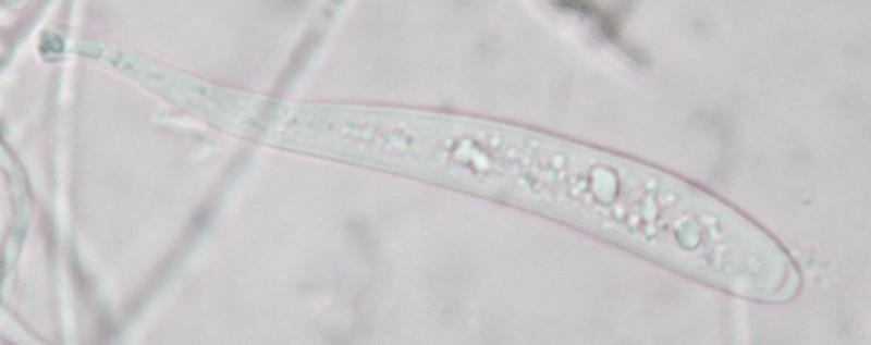 les rares asques matures étaient à 8 spores, à guttules irrégulières et certaines à 1 cloison