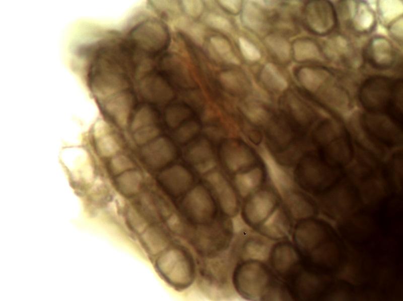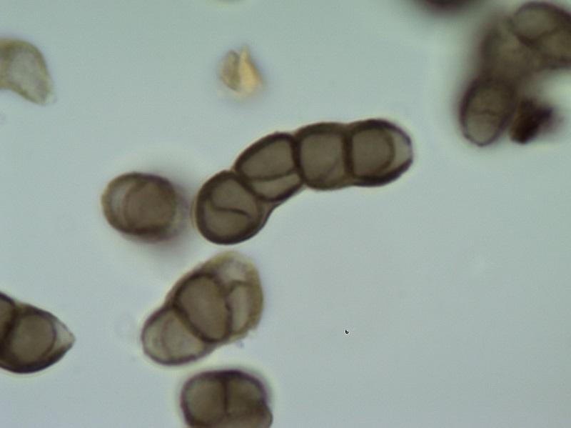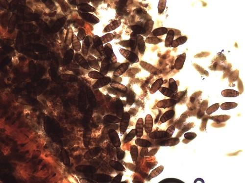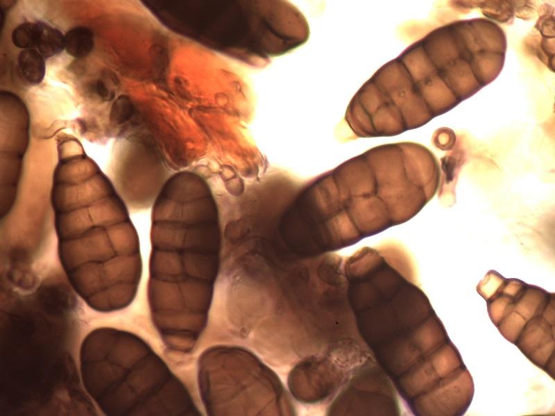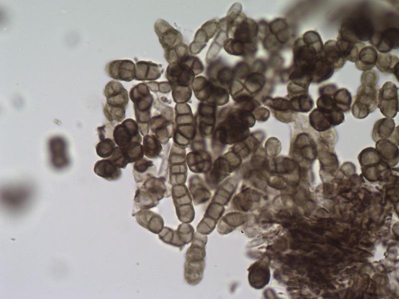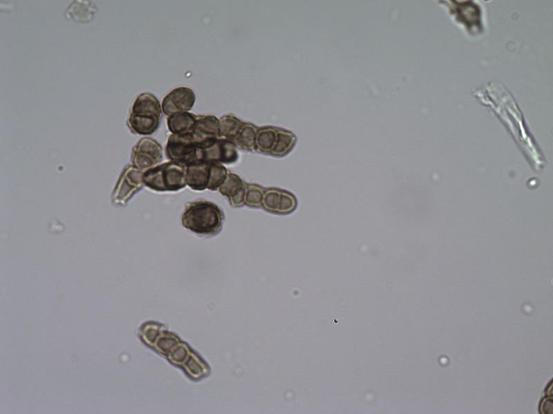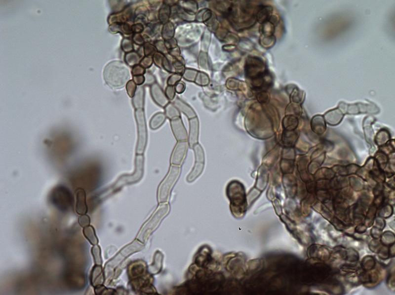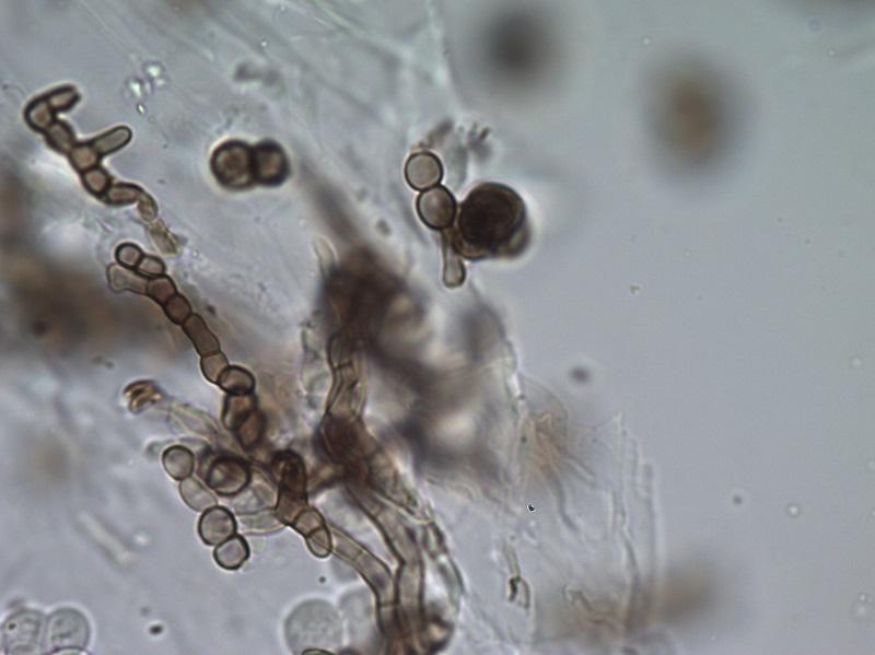 - Au micro, conidies en chaînes, parfois ramifiées, brunes, lisses ou verruqueuses, de formes très variées et plus ou moins septées (la plupart, entre 1 et 4 septes me demble-t'il); 5-11 µm de large; longueur très variable