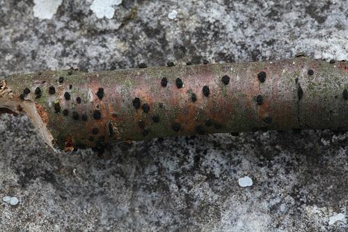 - Forme des petits stromas plus ou moins arrondis, érompant l'écorce (1,2 mm au maximum); poussière noire en passant le doigt dessus.