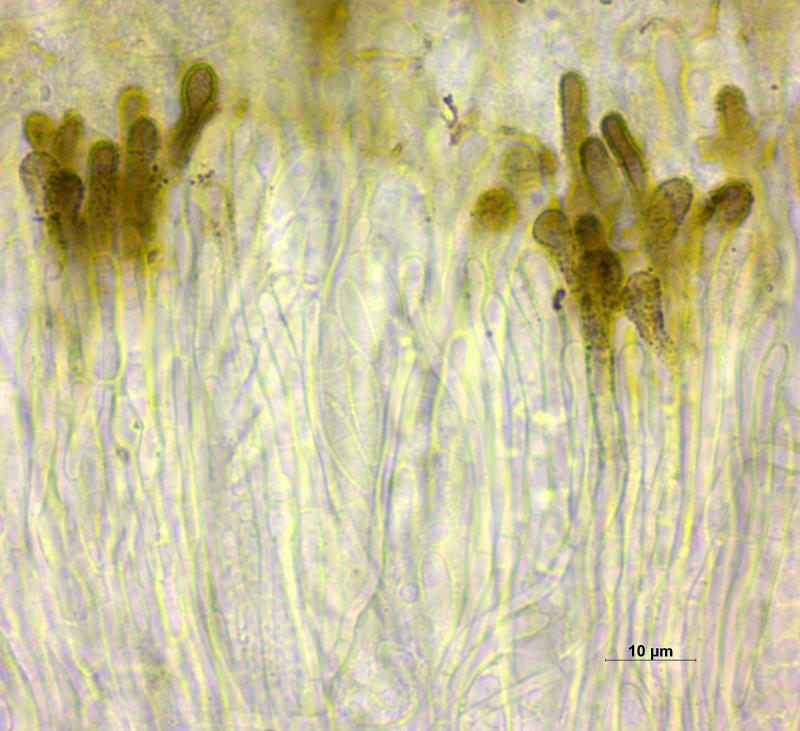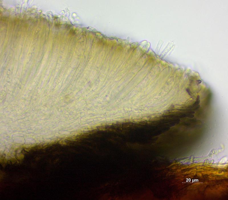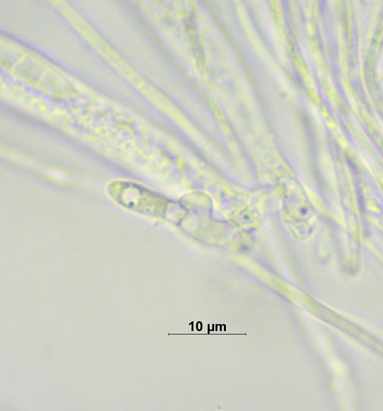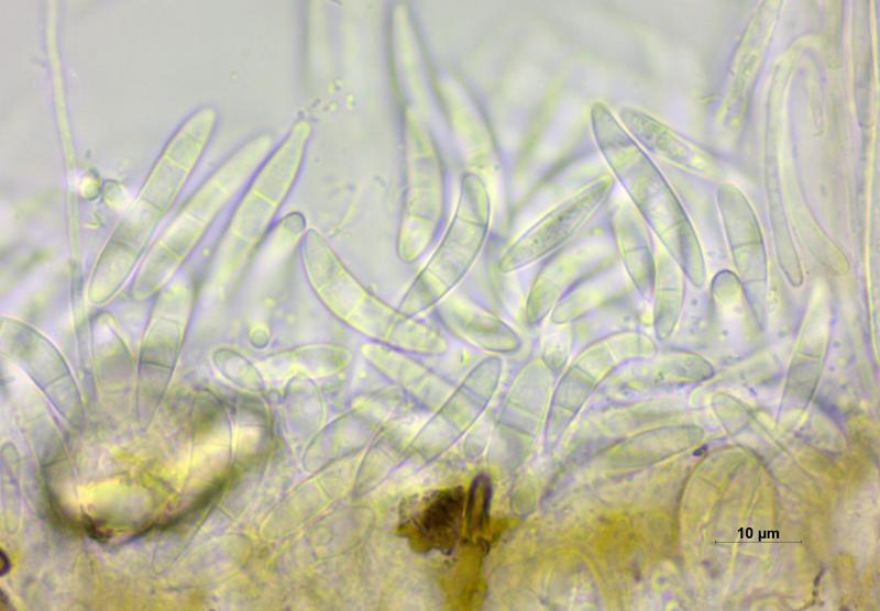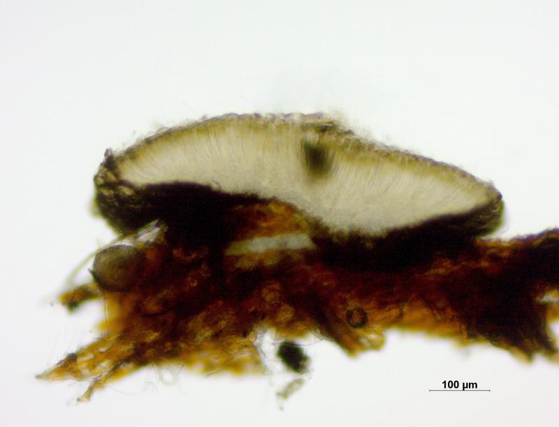 Sur branche décortiquée de Salix à 2'235 m, apothécies 0.25-0.50 mm de diamètre, sessile, hyménium gris/noir, surface externe couverte de poils bruns, asques 75 - 88 x 8.5 - 10 µm, IKI-, octosporés, spores lisses, hyalines, 3 - 4 cloisons à maturité, 18 - 28 x 3.5 - 4.5 µm, paraphyses élargies au sommet.