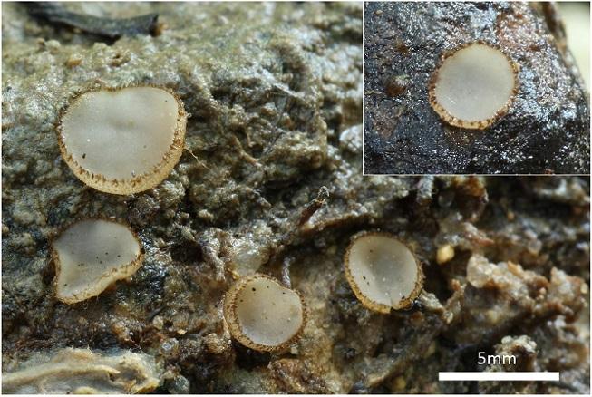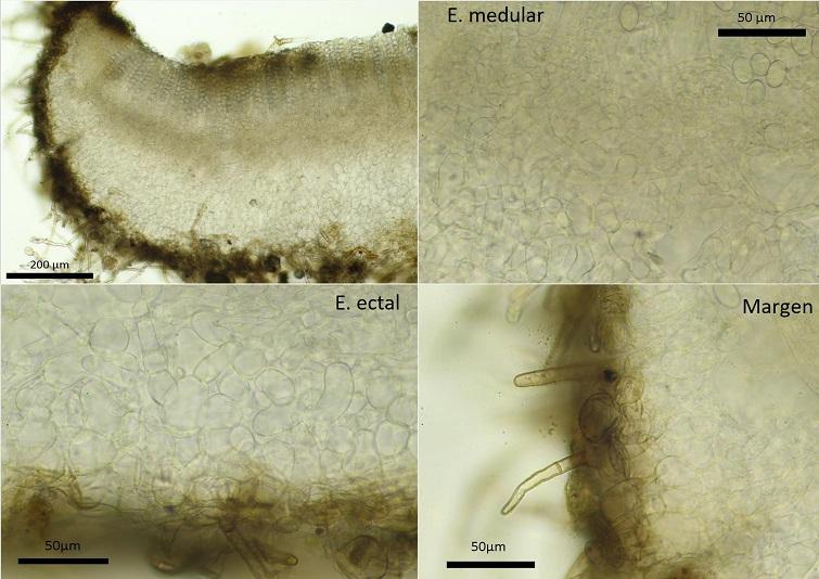Apotecios de hasta 6mm, con himenio de color gris-blanquecino.