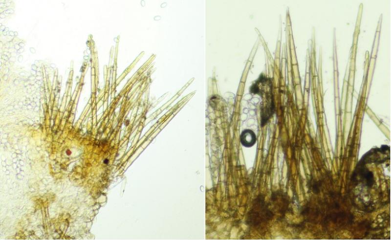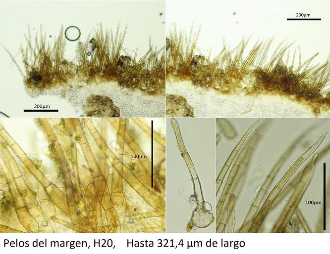 Pelos marginales de hasta 320 µm de largo, de color marrón, multiseptadas, con el ápice normalmente redondeado, algunos en punta o acuminados, con la base gruesa.