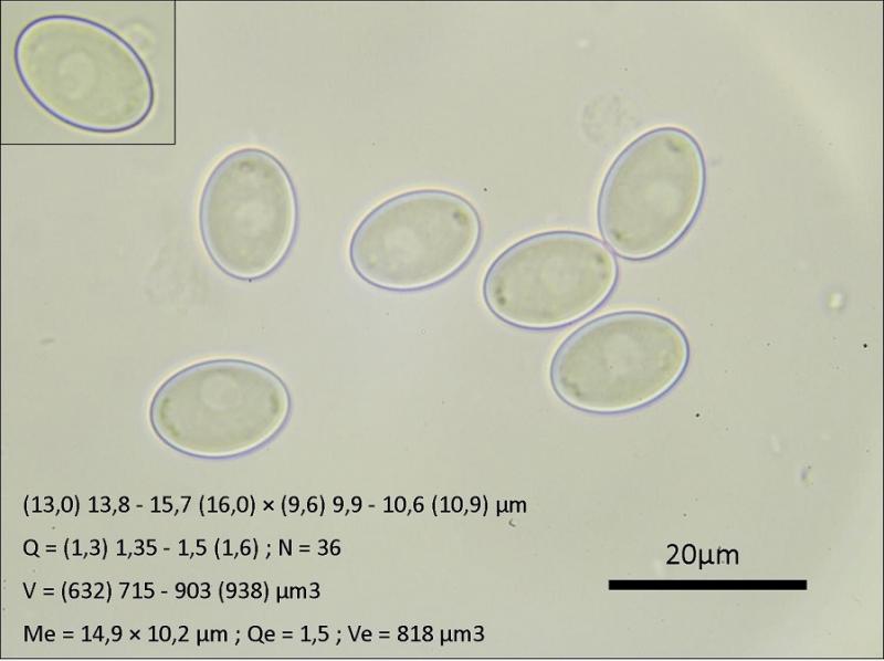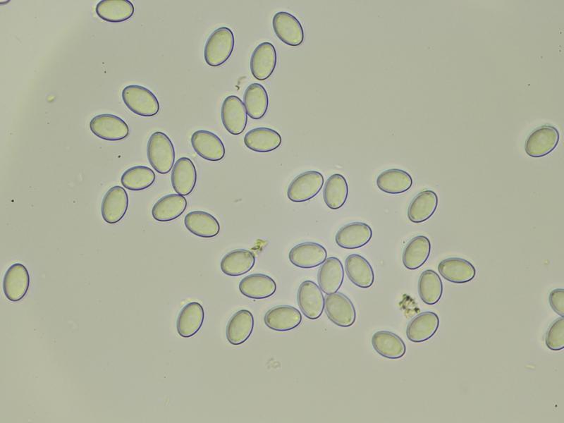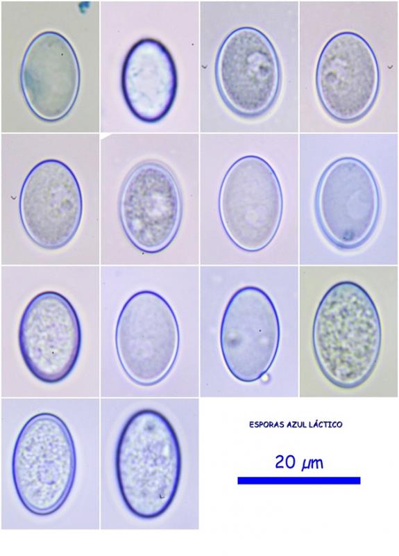 Esporas elipsoidales, con pequeñas manchas en sus extremos, en agua no se observa ni se intuye ningún tipo de ornamentación, en Azul Láctico parece que presentan una leve ornamentación a modo de pequeños puntos, muy difícil de observar.