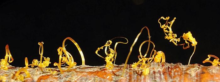 En anteriores ocasiones hemos encontrado sobre Populus Cytospora chrysosperma, pero esta colección nos pareció diferentes, tanto por el hábitat, como por la forma de los zarzillos, más pequeños, delgados, enmarañados y de color naranja, no rojizo ni amarillo. Las conidias son también bastante diferentes y recuerdan en morfologia a Fusarium.